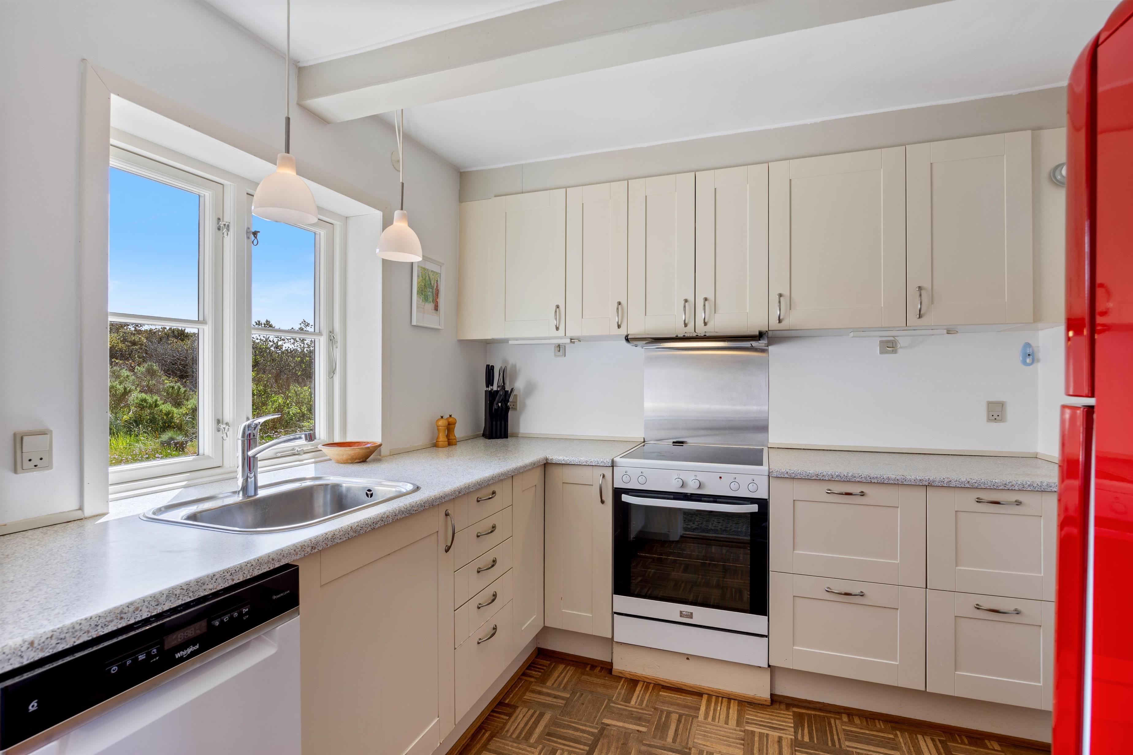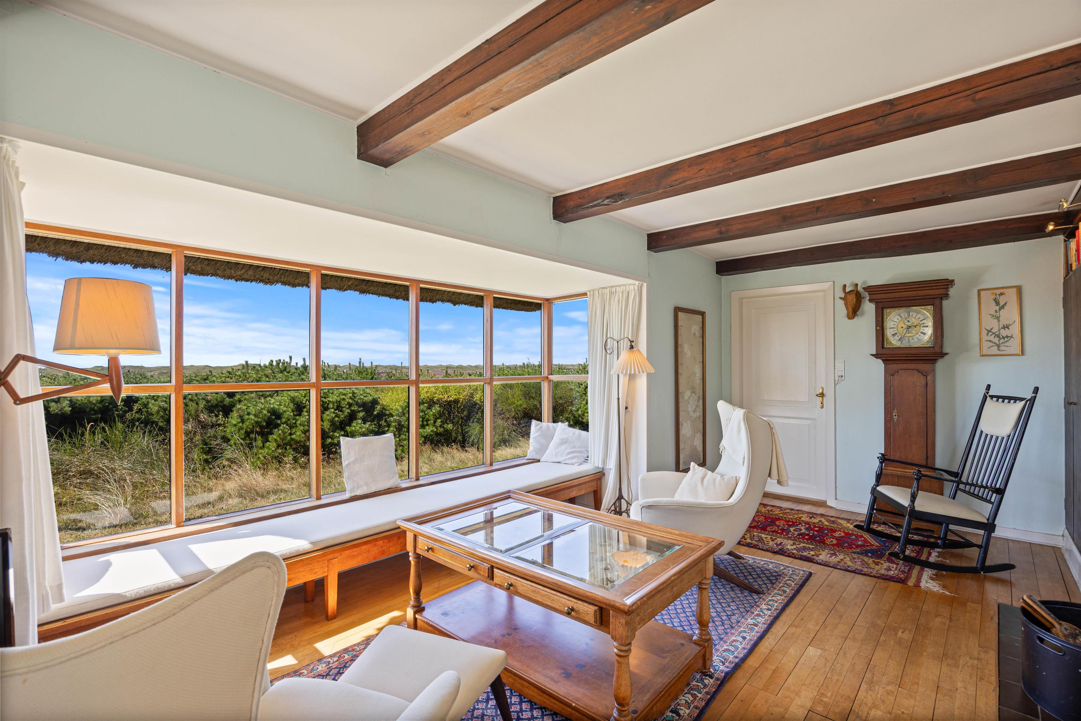 I stuen med brændeovn kan du nyde en kop kaffe og en god bog på bænken i vindueskarmen eller i en af lænestolene. Herfra har du den skønneste udsigt over Vesterhavets klitter. I kan med fordel benytte varmepumpen til at holde en behagelig temperatur i rummet.