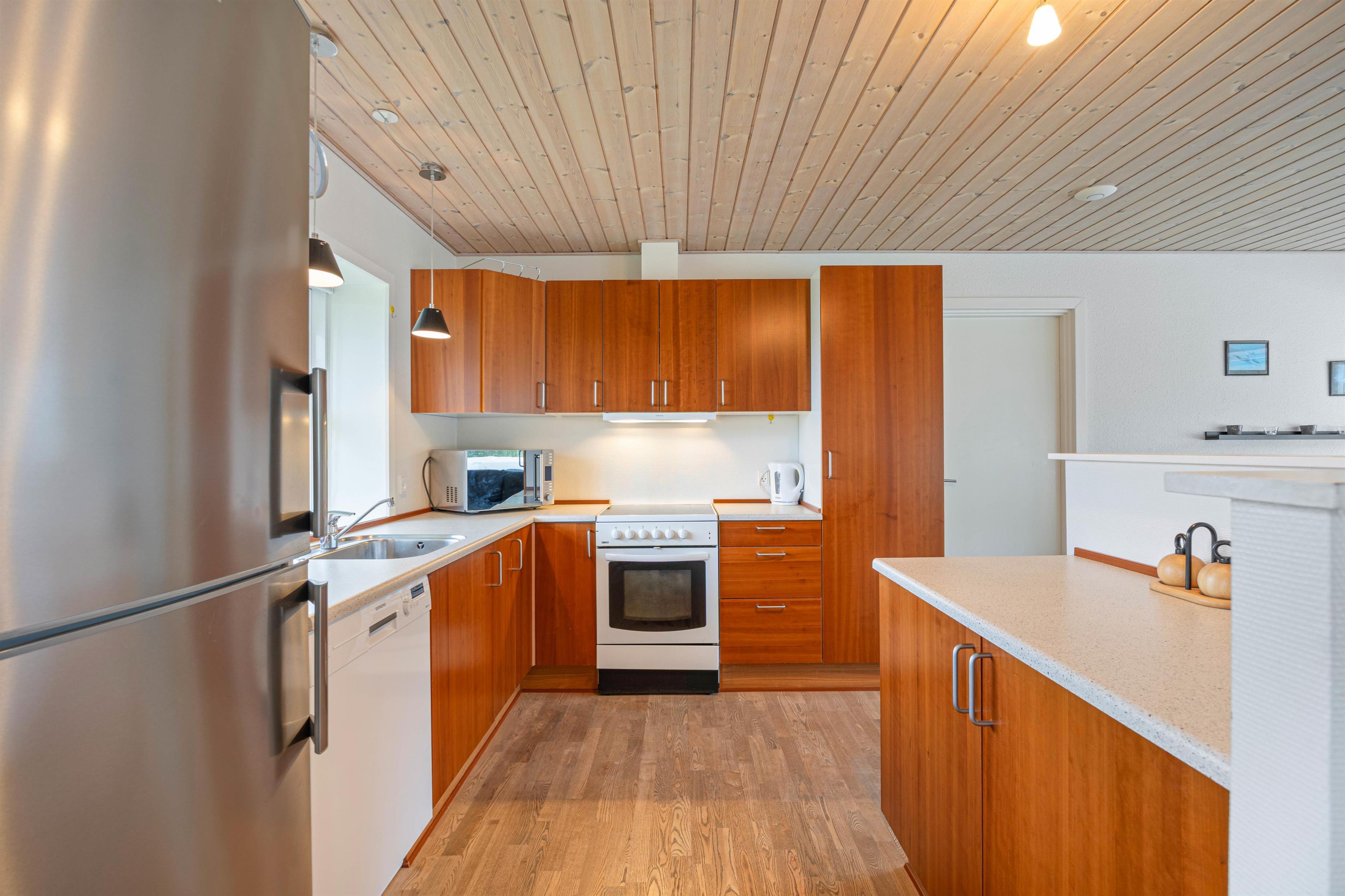 Indenfor præsenterer sommerhuset en gennemtænkt planløsning og god indretning. Stuen indbyder til hyggelige stunder med sin brændeovn – især på kølige dage spreder det knitrende bål en behagelig varme. En energibesparende varmepumpe og gulvvarme på badeværelset bidrager til komforten. Det åbne køkken er fuldt udstyret med alt, hvad du behøver for at tilberede jeres yndlingsretter – inklusiv opvaskemaskine. Praktisk nok er der også vaskemaskine og tørretumbler, så I nemt kan klare tøjvasken under opholdet.