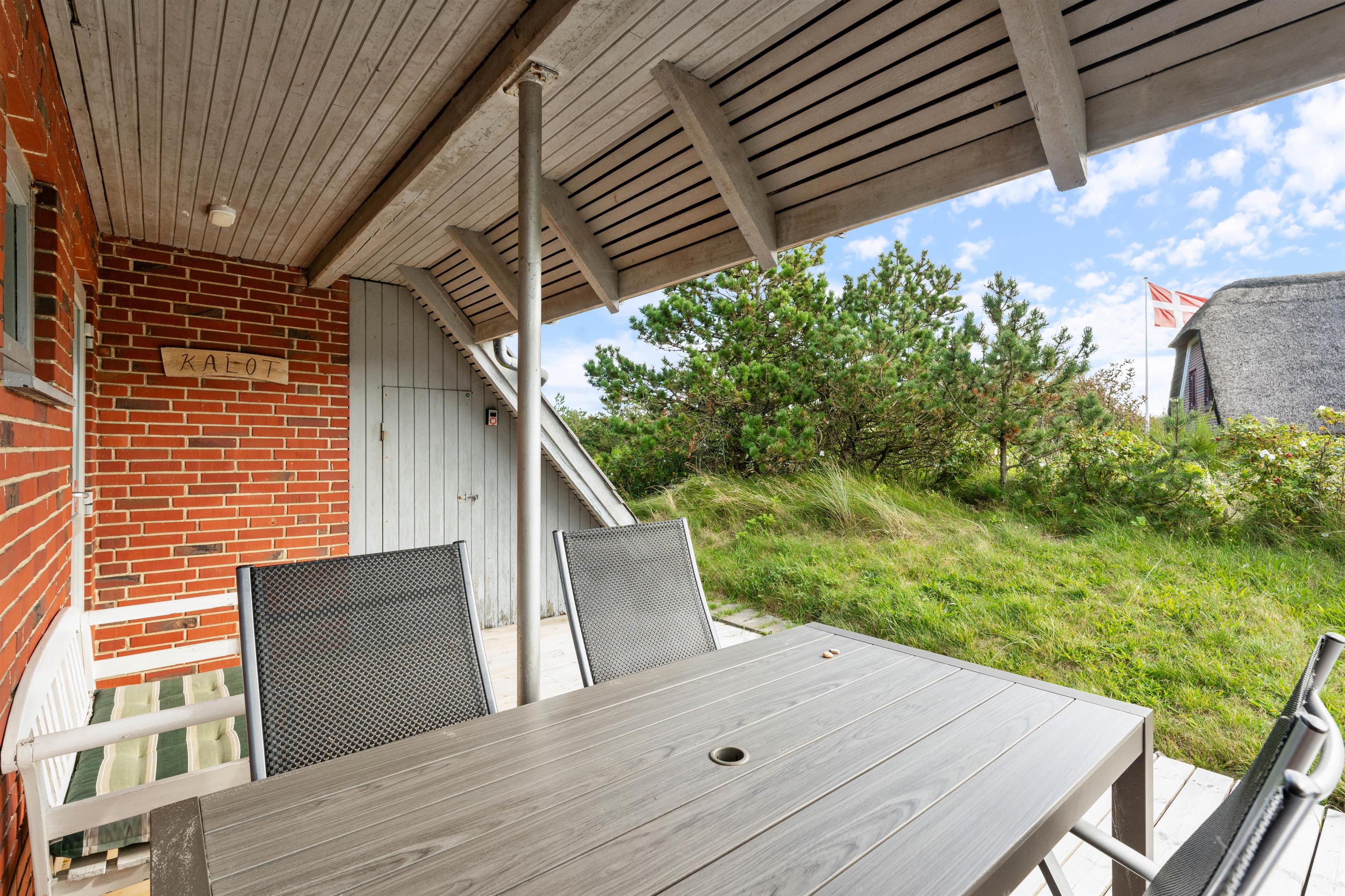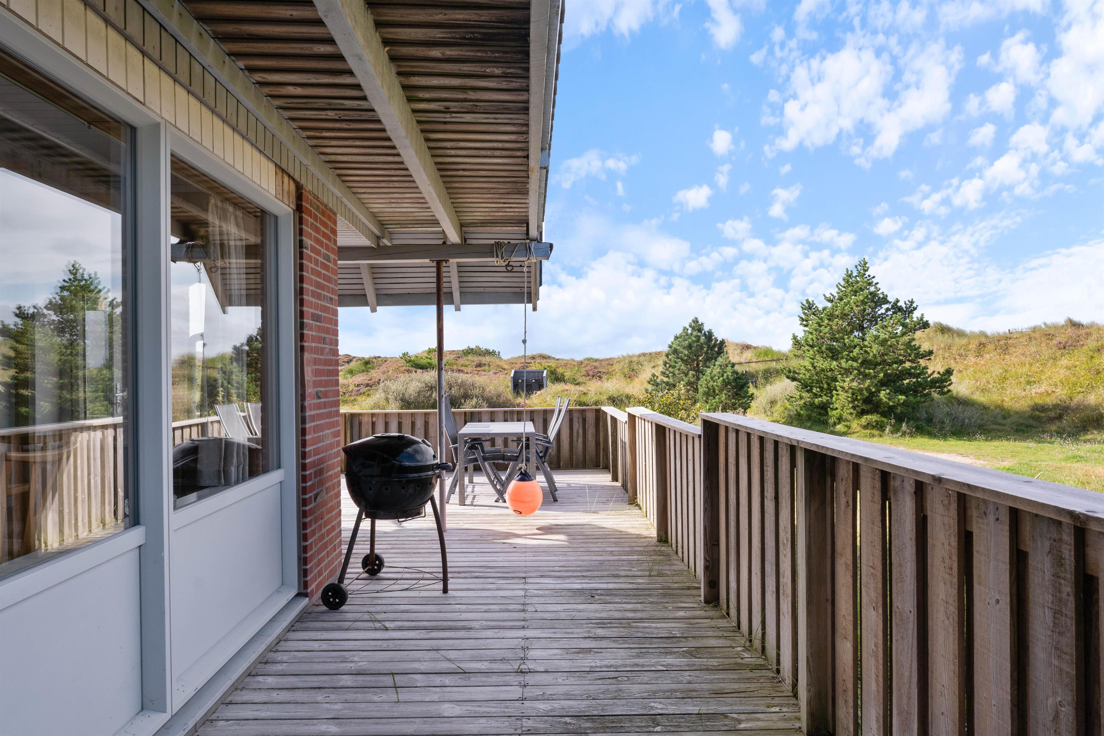På sommerhusets delvist overdækkede terrasse kan I slappe af og nyde udsigten til det smukke landskab. Her er det helt perfekt til grillaftener og afslapning med en god bog på en lun sommerdag. Terassen strækker sig fra østsiden, om syd, til vestsiden af feriehuset, så I har mulighed for at nyde solen hele dagen.