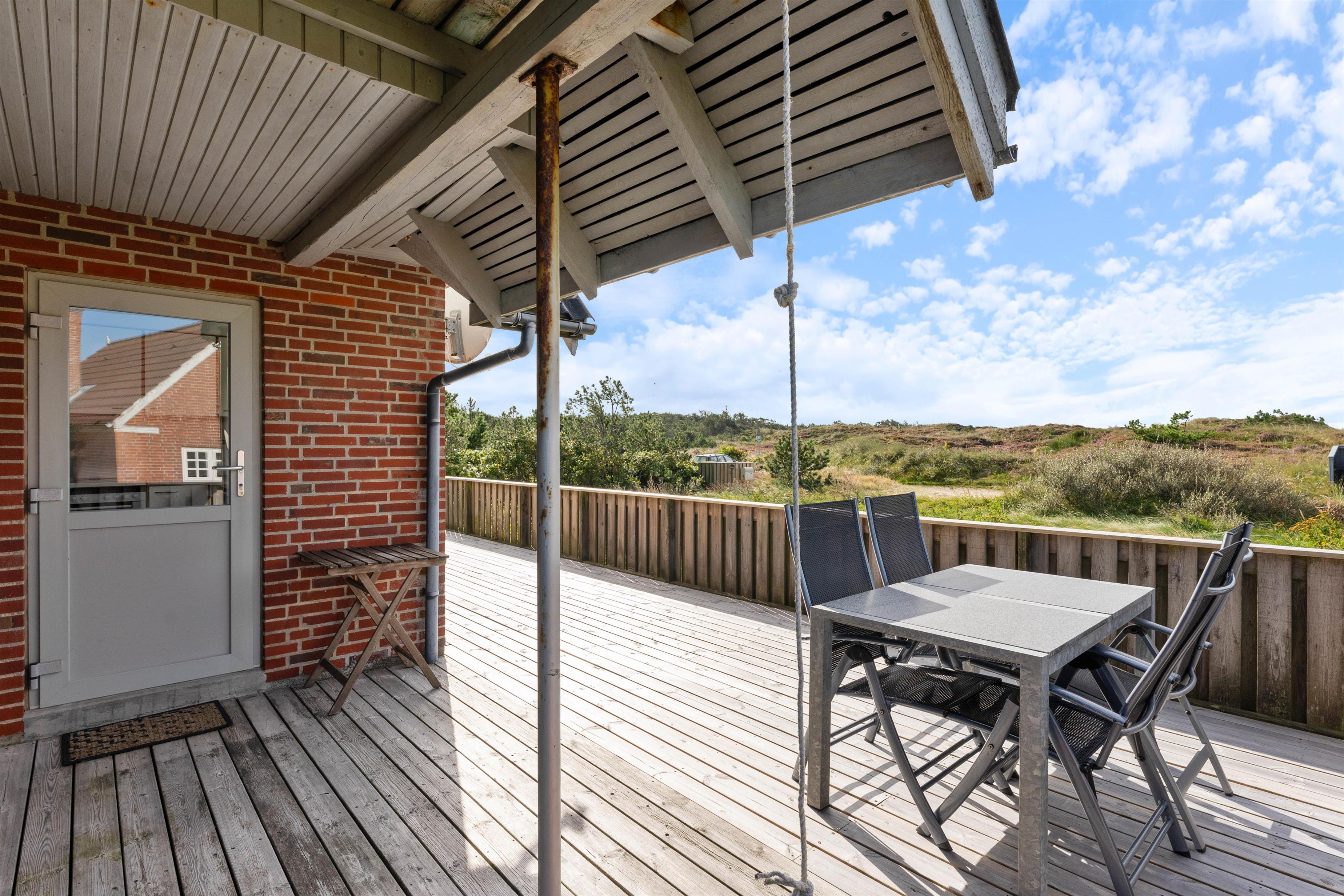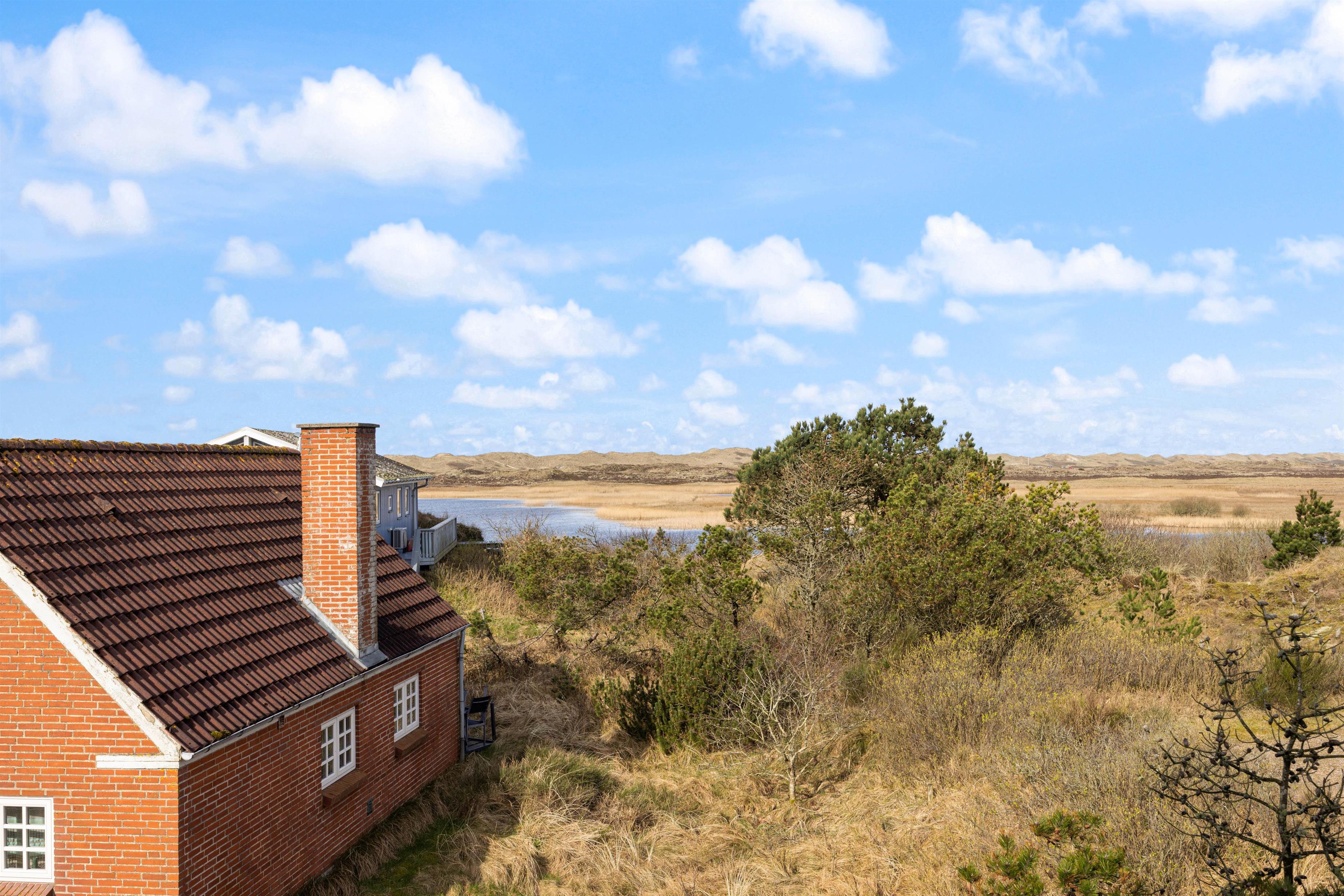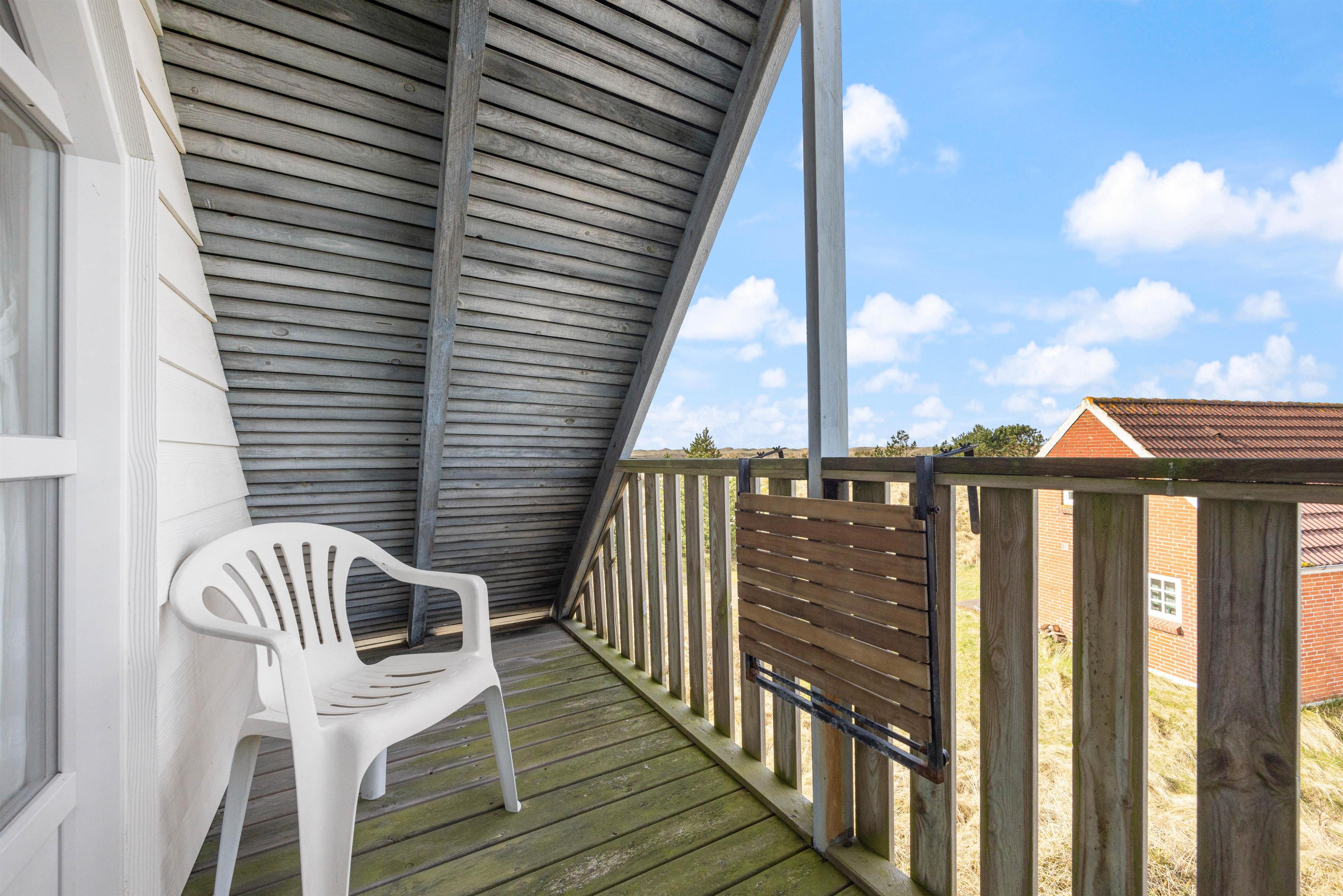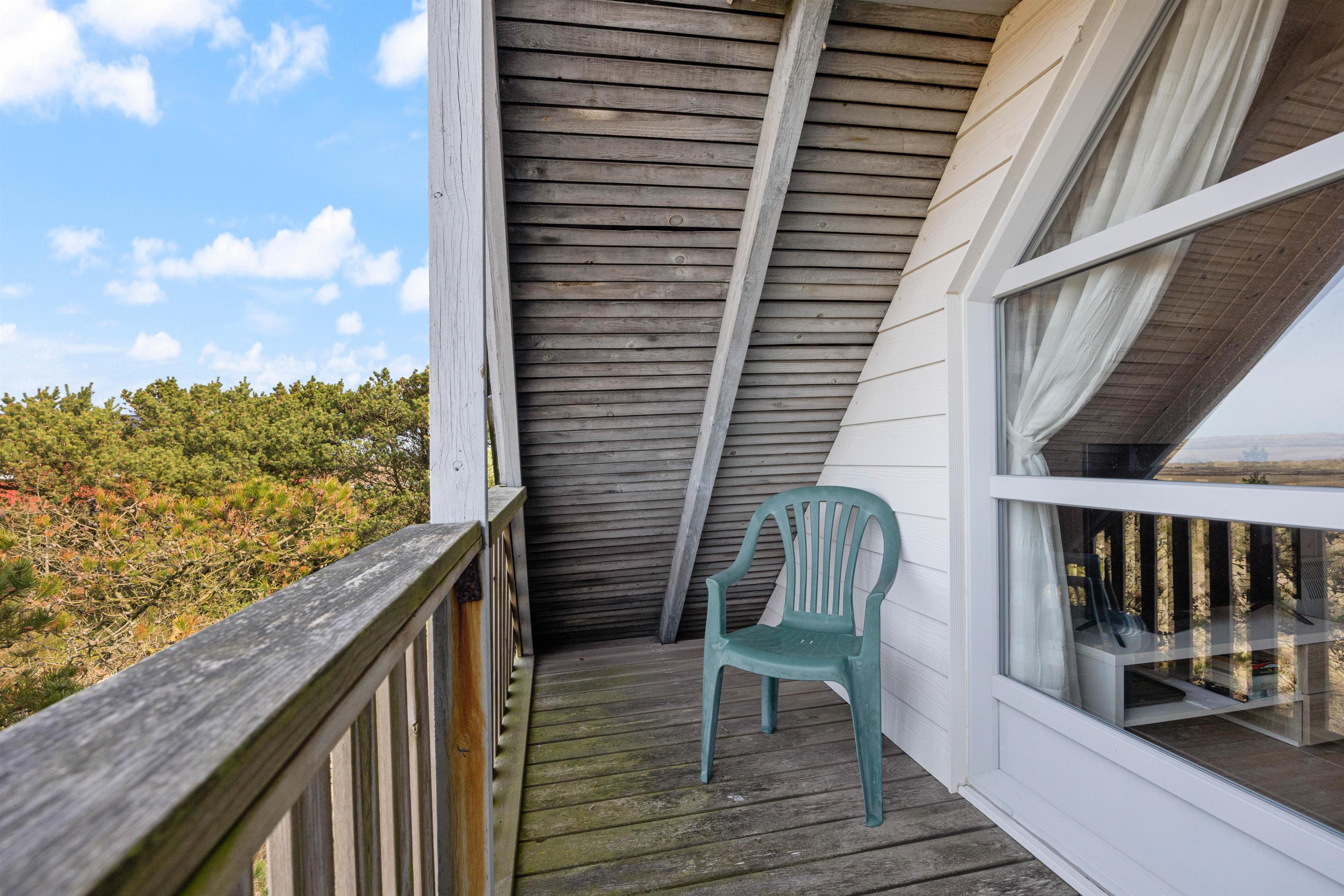 Fra sommerhusets 1. sal har I udgang til en lille altan, hvorfra I har en skøn udsigt over Nyminde Strøm og klitterne ved Vesterhavet.