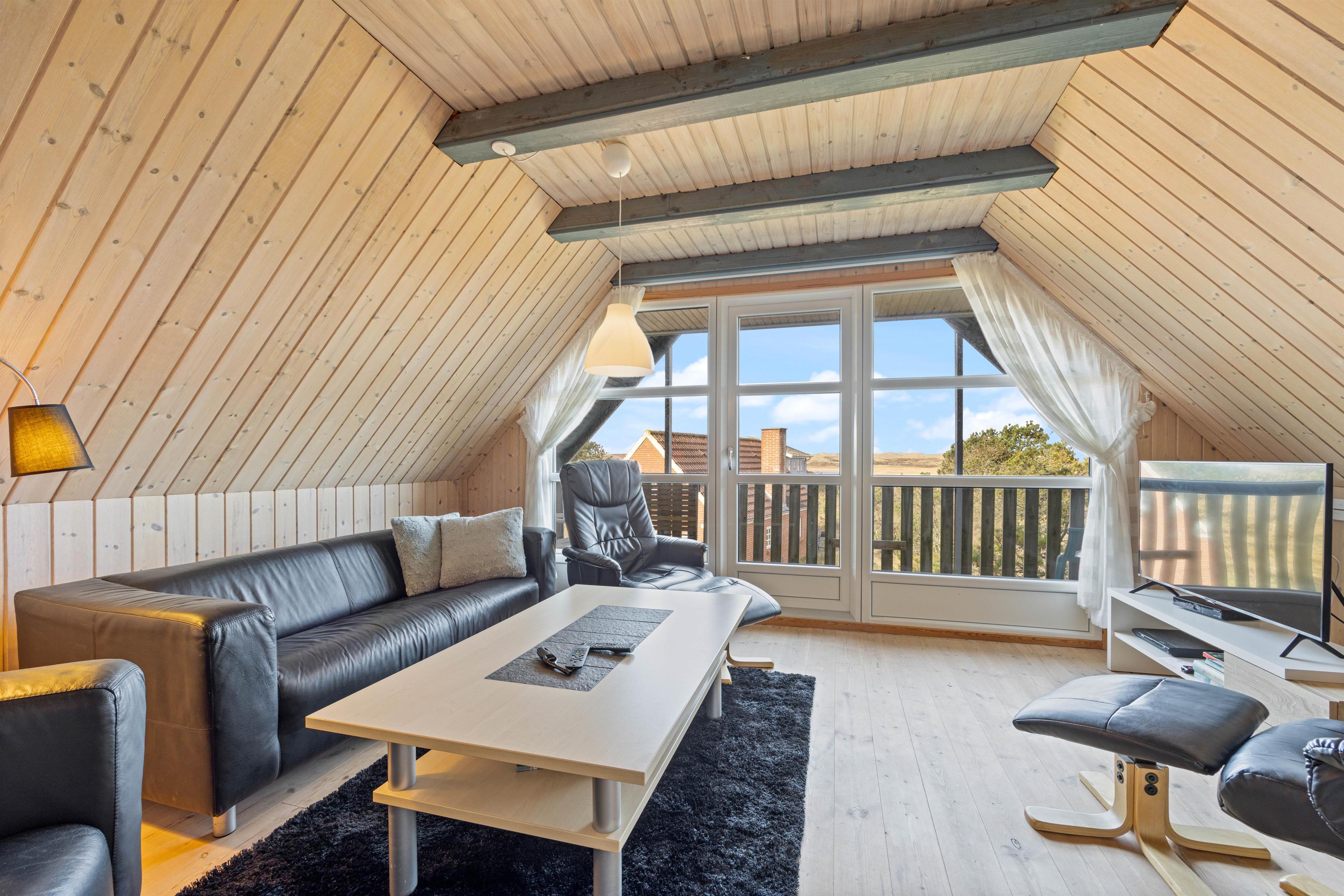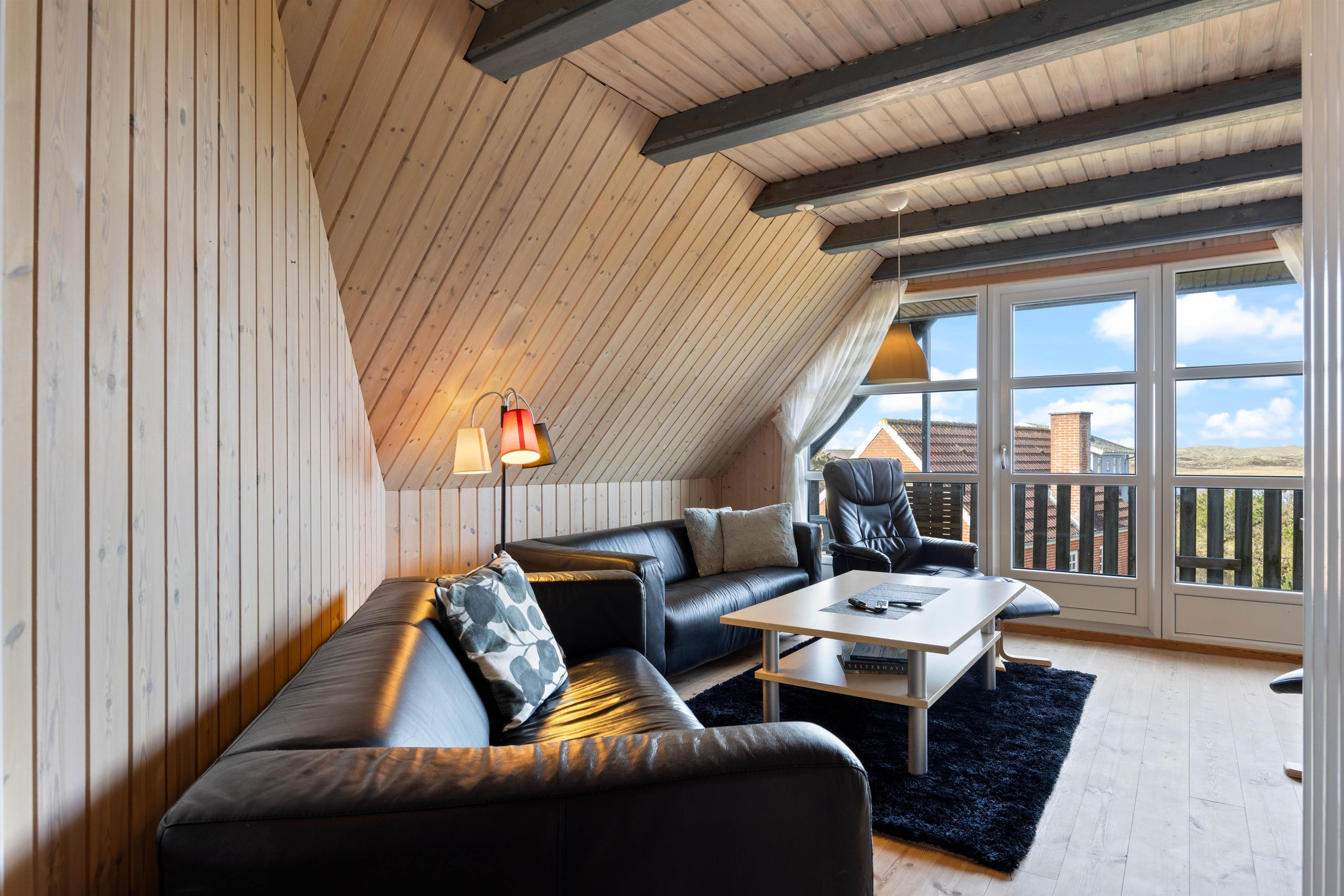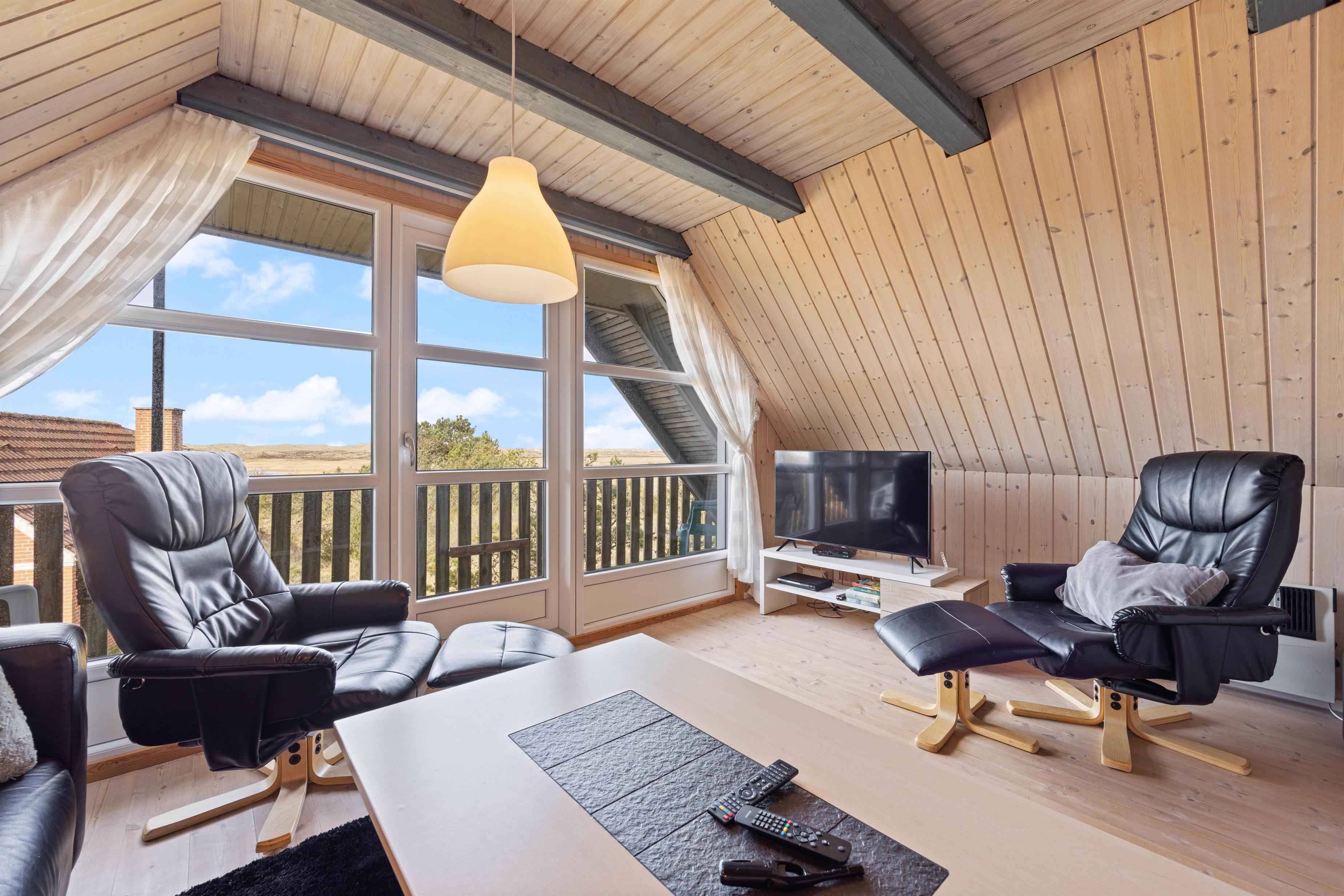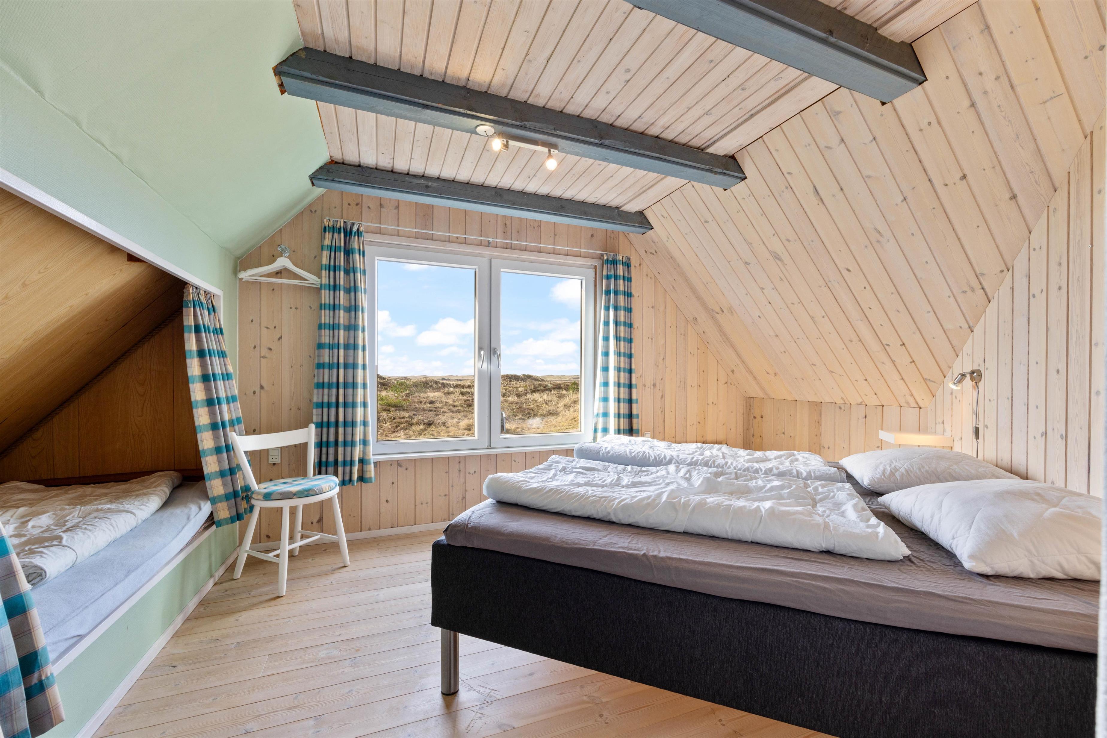 Fra sommerhusets 1. sal har I udgang til en lille altan, hvorfra I har en skøn udsigt over Nyminde Strøm og klitterne ved Vesterhavet.