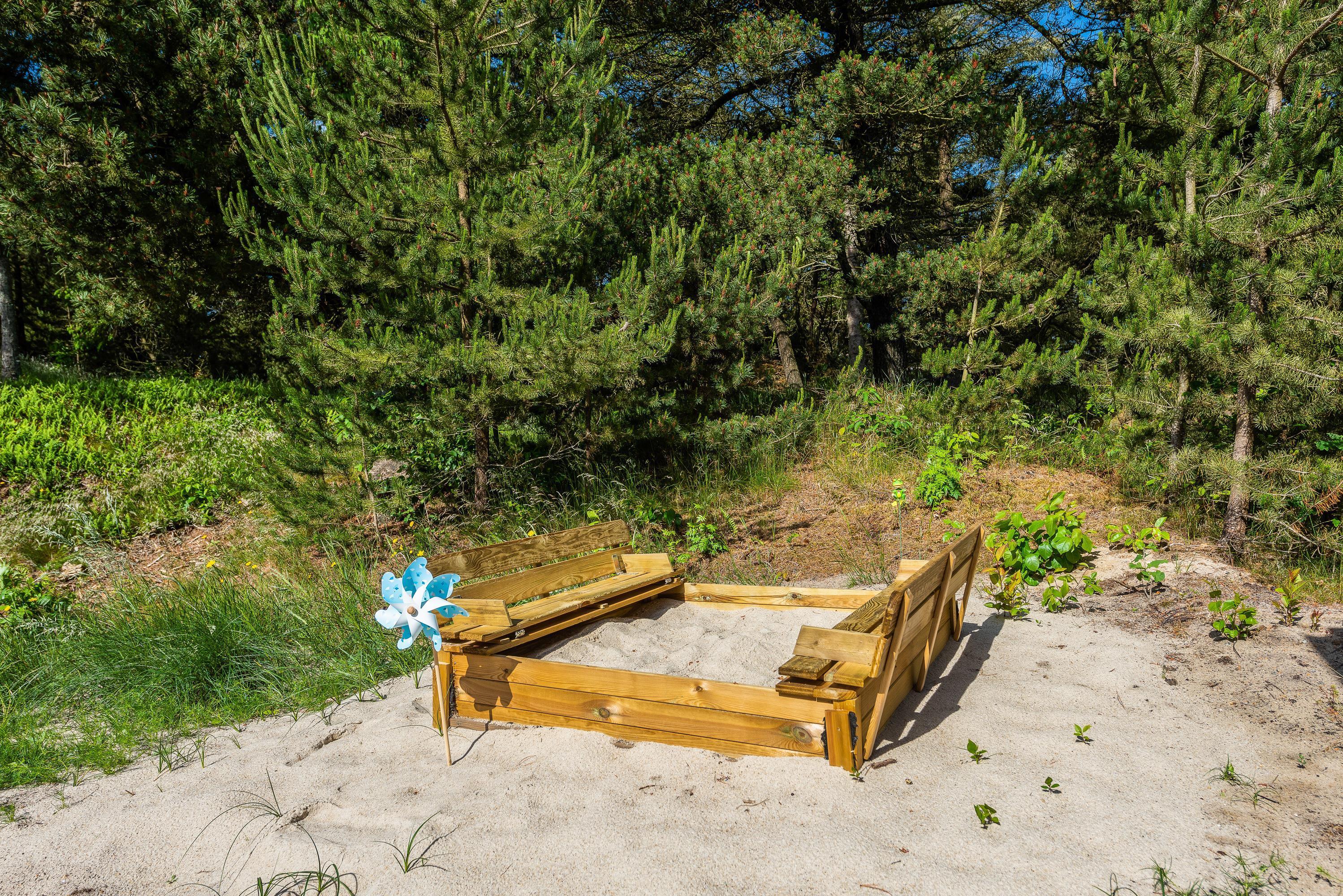 Den flotte træterrasse er udstyret med havemøbler, liggestole og en grill, mens de mindste kan glæde sig over sandkassen. Et ekstra highlight er den udendørs bruser, hvor de friske kan snuppe et bad under åben himmel, og fødderne kan skylles rene for sand efter en tur ved Vesterhavet. Den udendørs bruser er både udstyret med koldt og varmt vand og kan benyttes fra april til november.