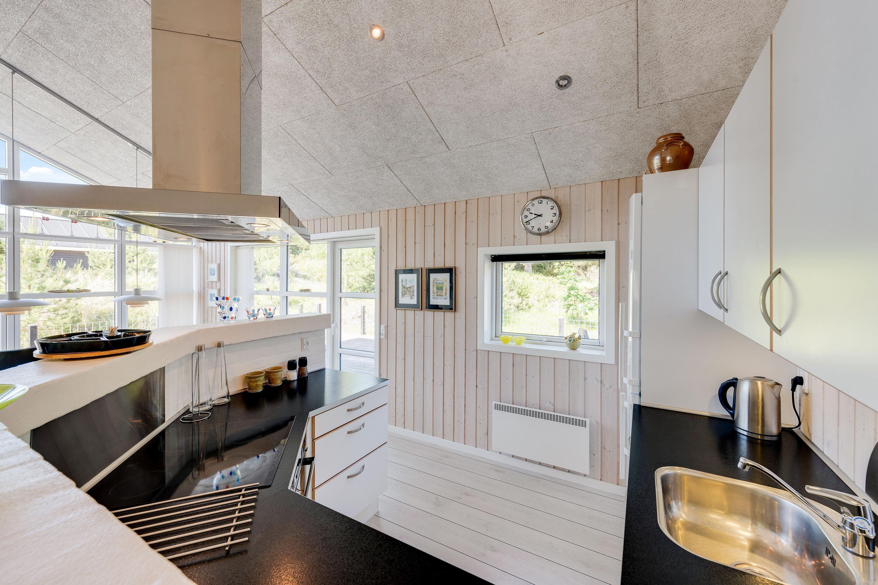 Et flot og rummeligt køkken står i åben forbindelse med stuen. Køkkenet er velindrettet og har stort køle-fryseskab, opvaskemaskine og mikrobølgeovn. I den rummelige stue er der åbent til kip og masser af lysindfald gennem de store glaspartier ved terrassen. Stuen har laminatgulv og er flot indrettet med den klassiske brændeovn, der tilfører ekstra meget hyggelig feriestemning.