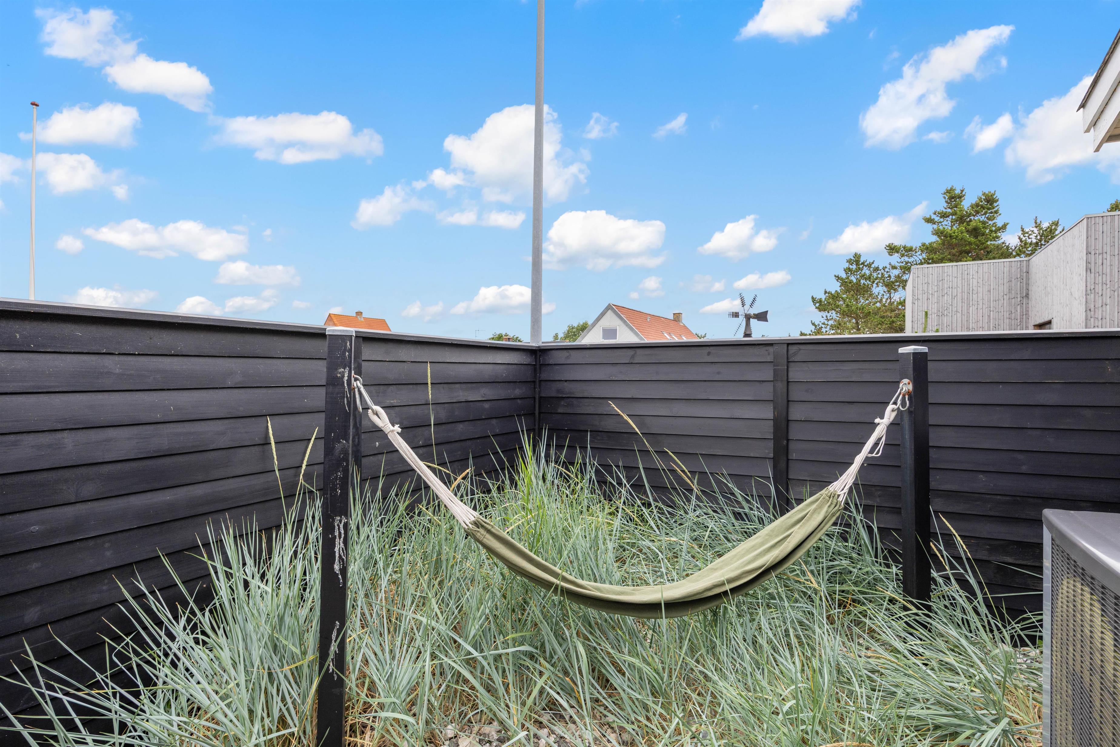 Haven er indhegnet og derfor et oplagt valg for både småbørnsfamilien og hundeejere. Med trampolin og sandkasse kommer familiens mindste ikke til at kede sig. Den grønne plæne indbyder til sjov og spas for hele familien.