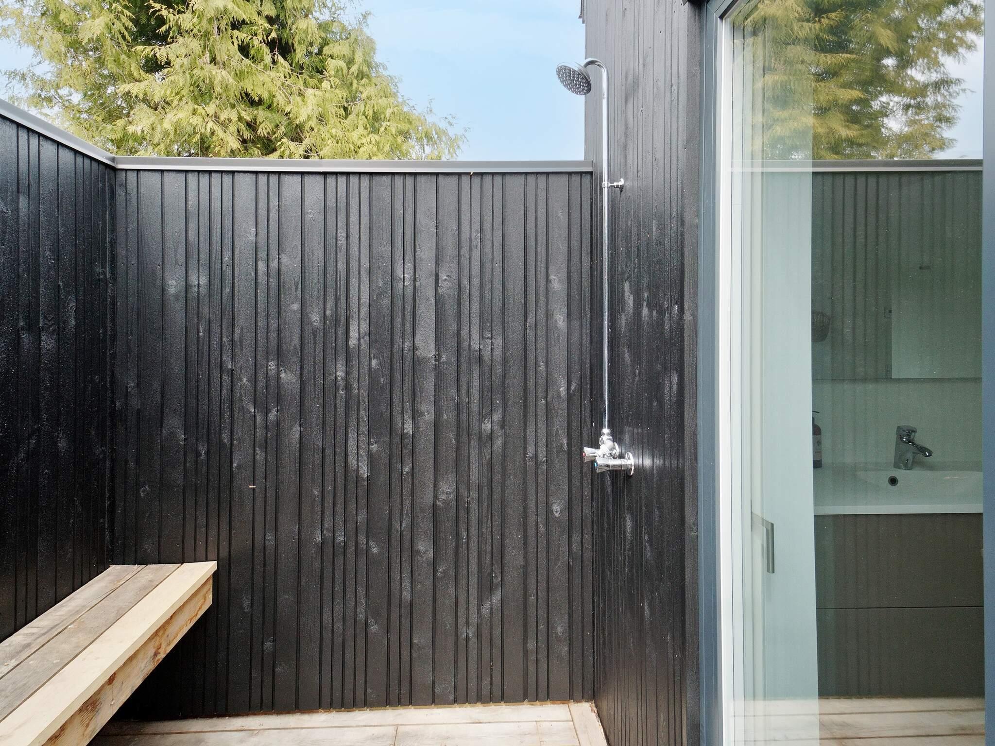 Udenfor har huset en overdækket terrasse, hvor du kan tilbringe hyggelige sommeraftener, skærmet mod vinden. Til den ultimative afslapning er der et brændefyret spabad med boblende funktion og en privat udendørs sauna. I de varmere måneder er der også en praktisk udendørs bruser tilgængelig. Børn kan lege trygt i havens sandkasse, mens den fuldt indhegnede gård sikrer tryghed for familiens hund med mad- og vandskåle.