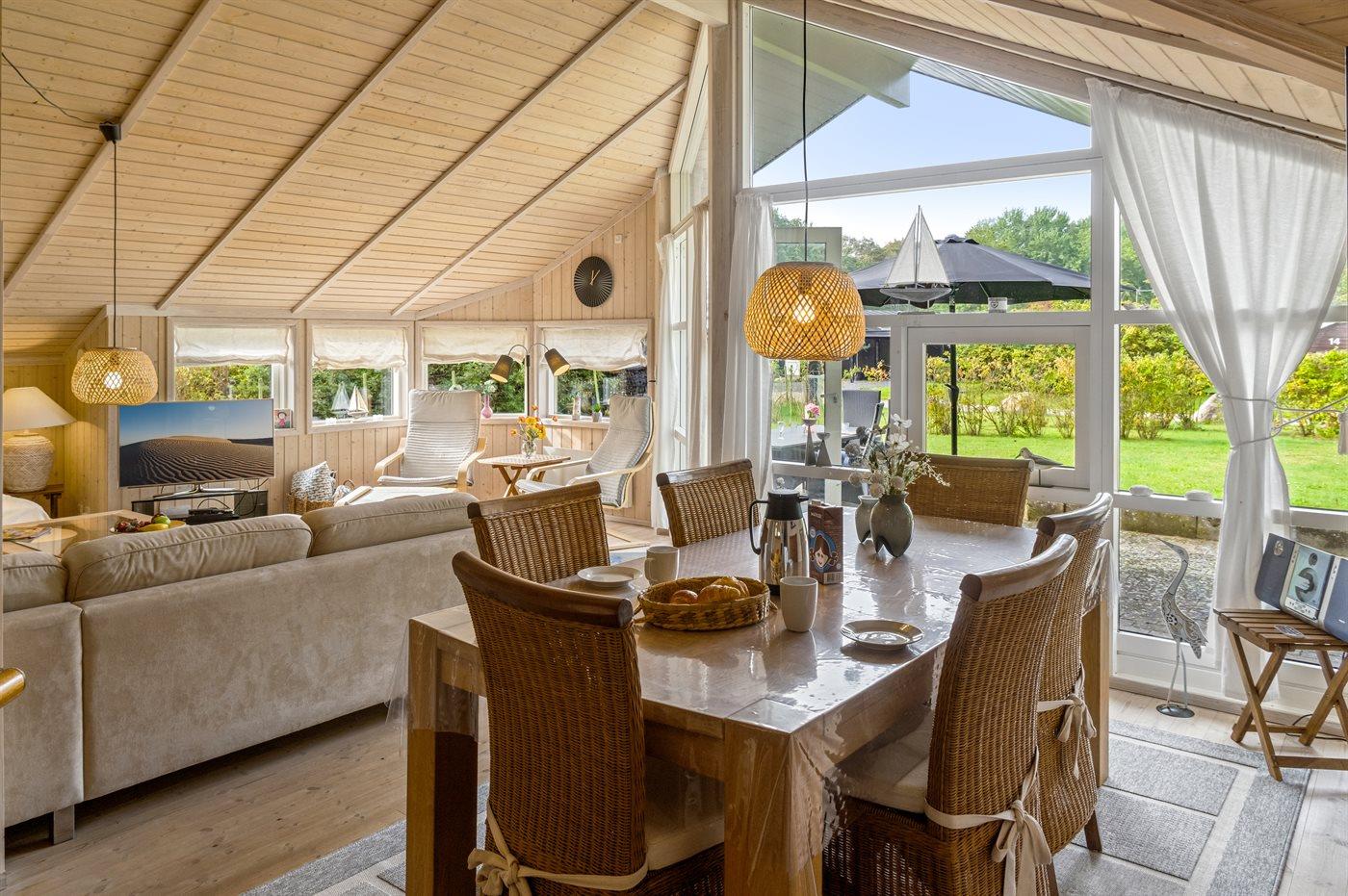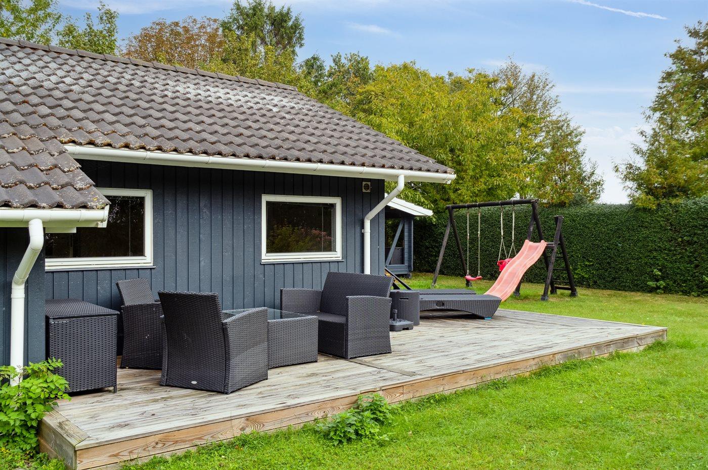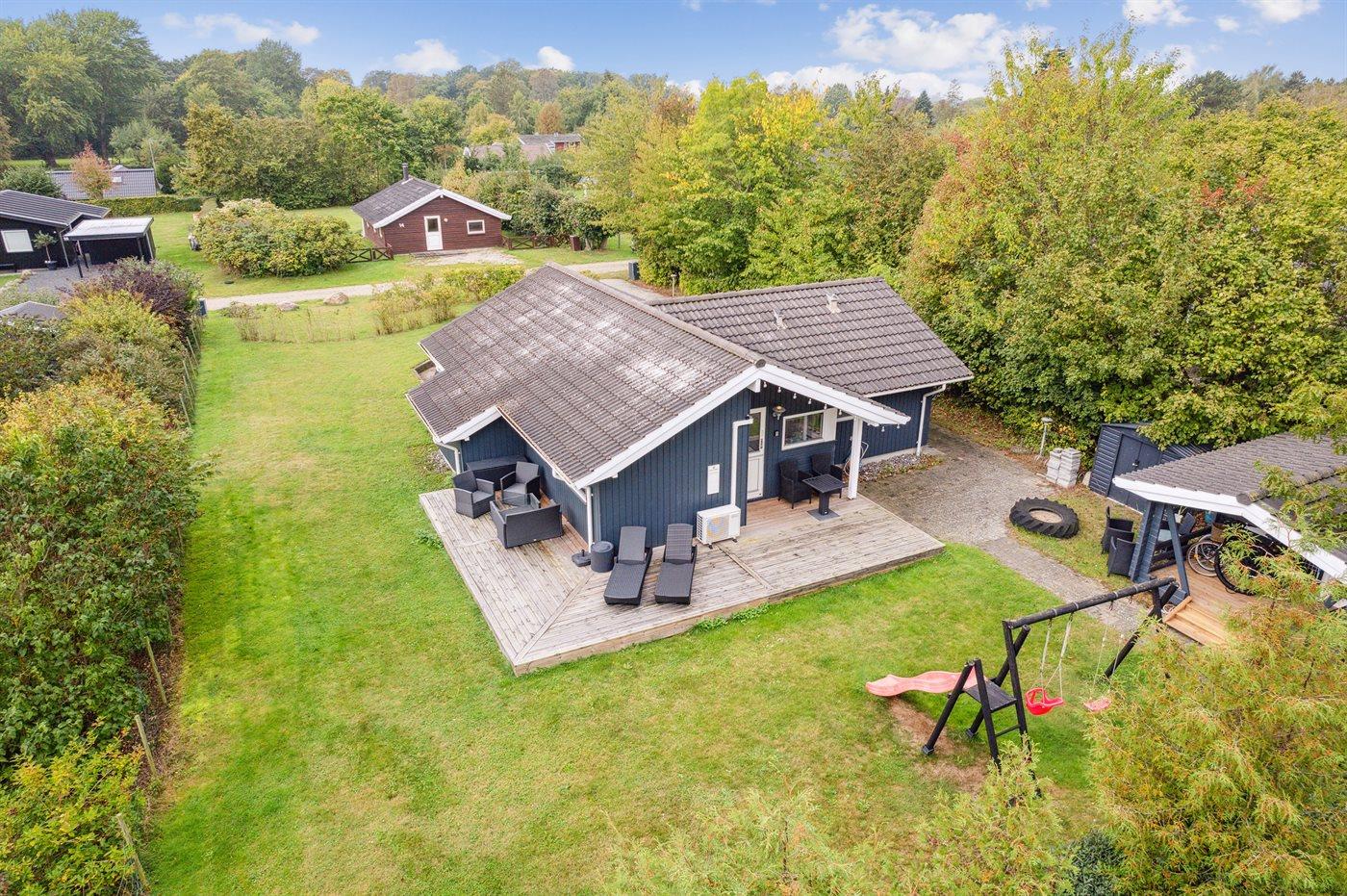 Ferieboligen er beliggende på en 850 m² stor naturgrund. Der er 200 m til havet. Nærmeste forretning er beliggende i en afstand af 1500 m. Til ferieboligen hører åbent terrasseareal. Desuden er der overdækket terrasse. Gynge. Sandkasse. Fodboldmål. Grill til rådighed. Parkering ved ferieboligen.