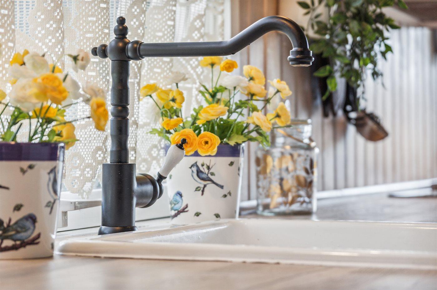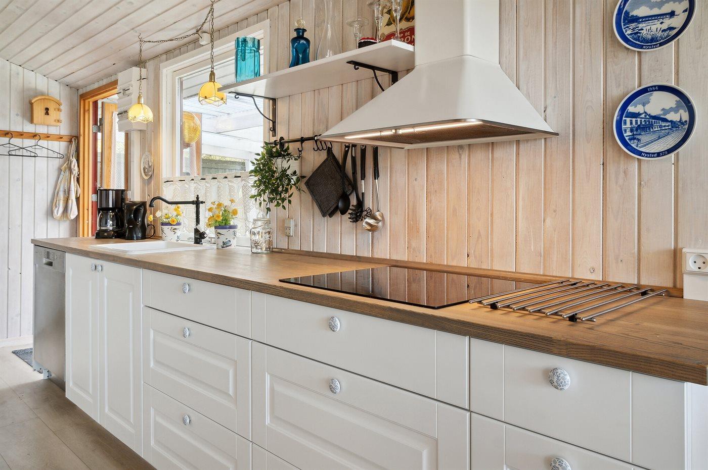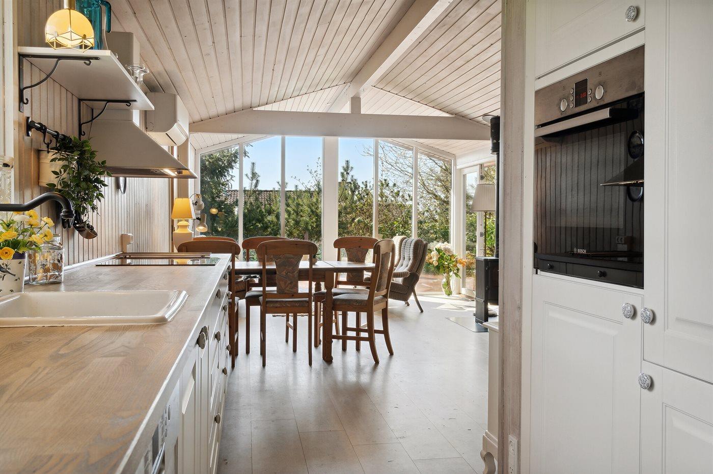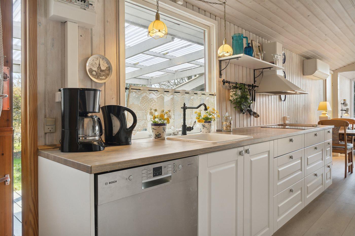 Køkkenet er udstyret med 1 køleskab. Der er 4 keramiske kogeplader, varmluftovn, mikrobølgeovn samt opvaskemaskine.