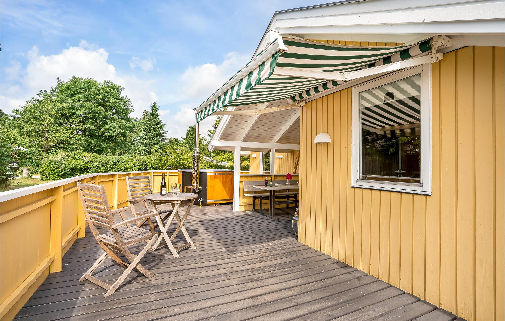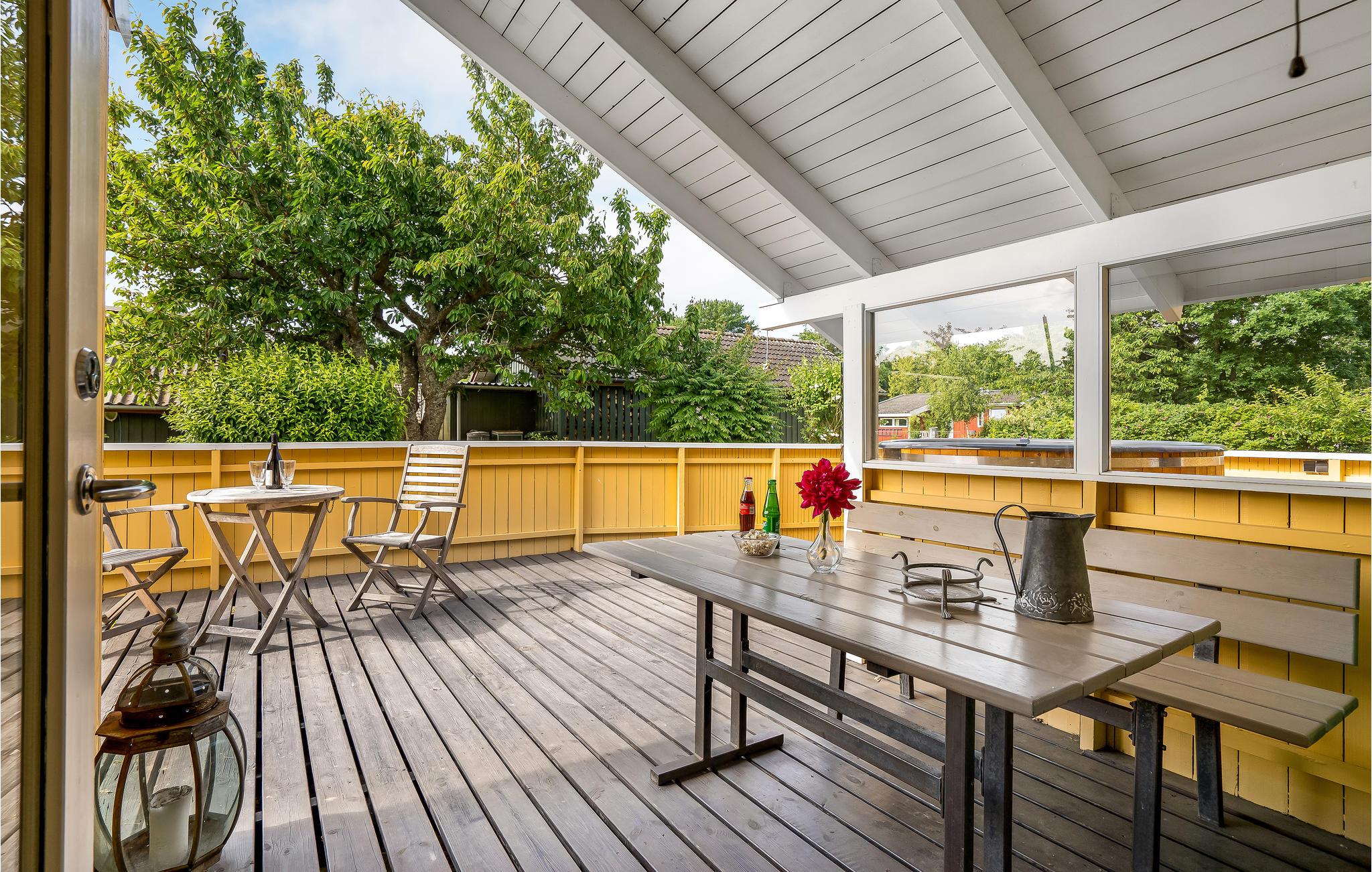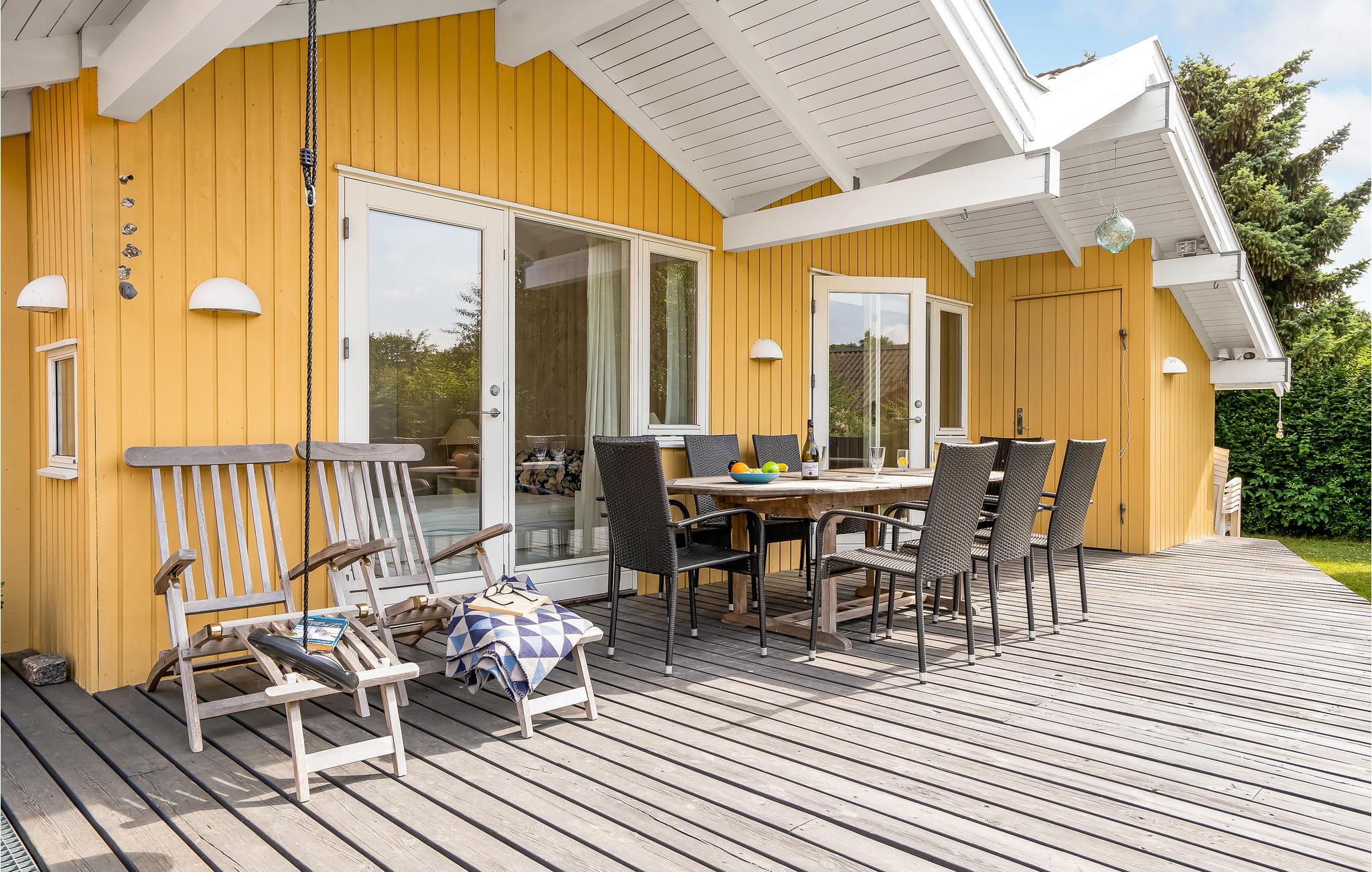 Hyggeligt sommerhus nær børnevenlig strand i Nysted med stor terrasse og udendørs køkken.