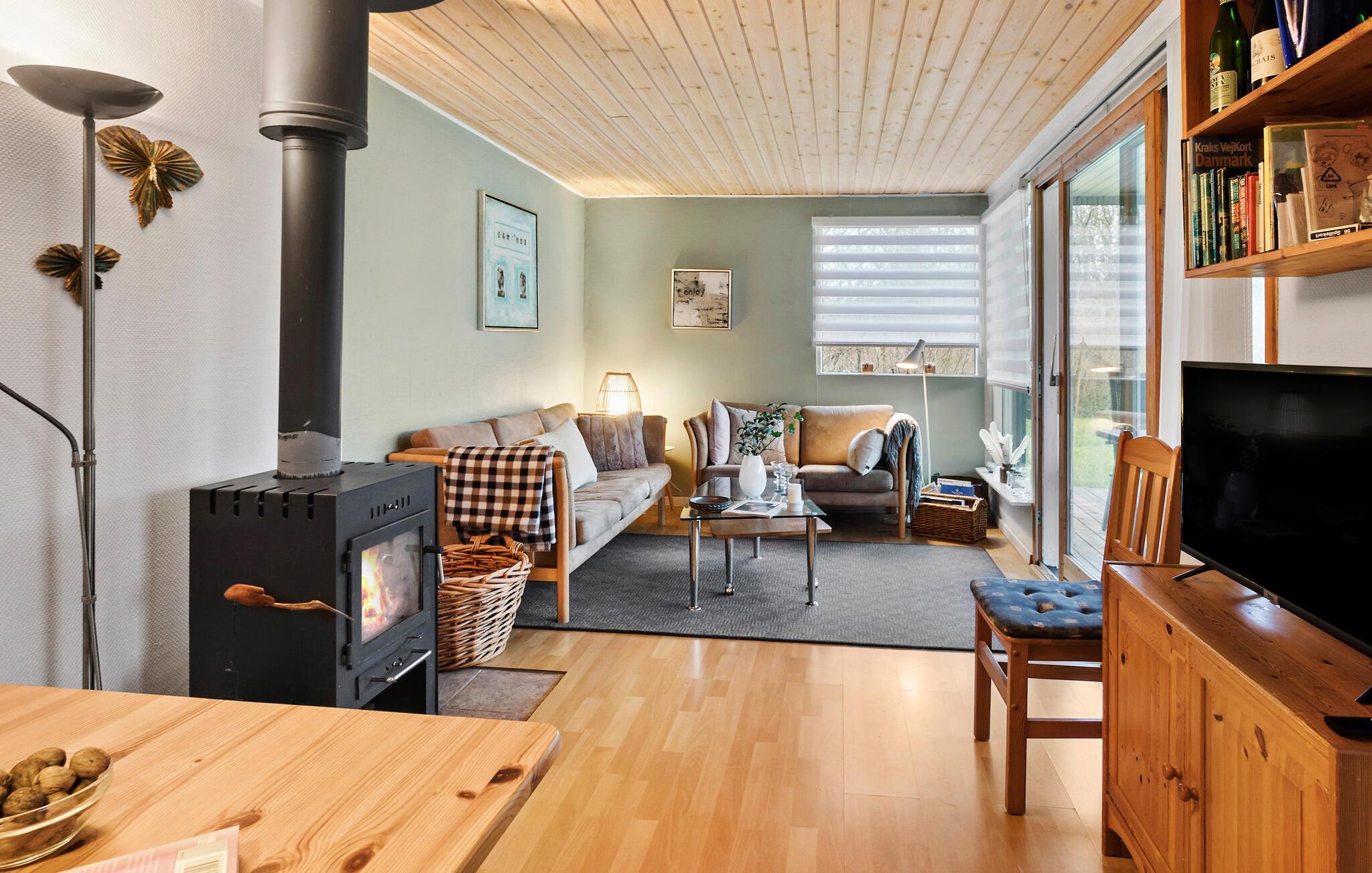 Hyggeligt træhus tæt på stranden i Nysted på Sydlolland med terrasse og brændeovn til en afslappende ferie.