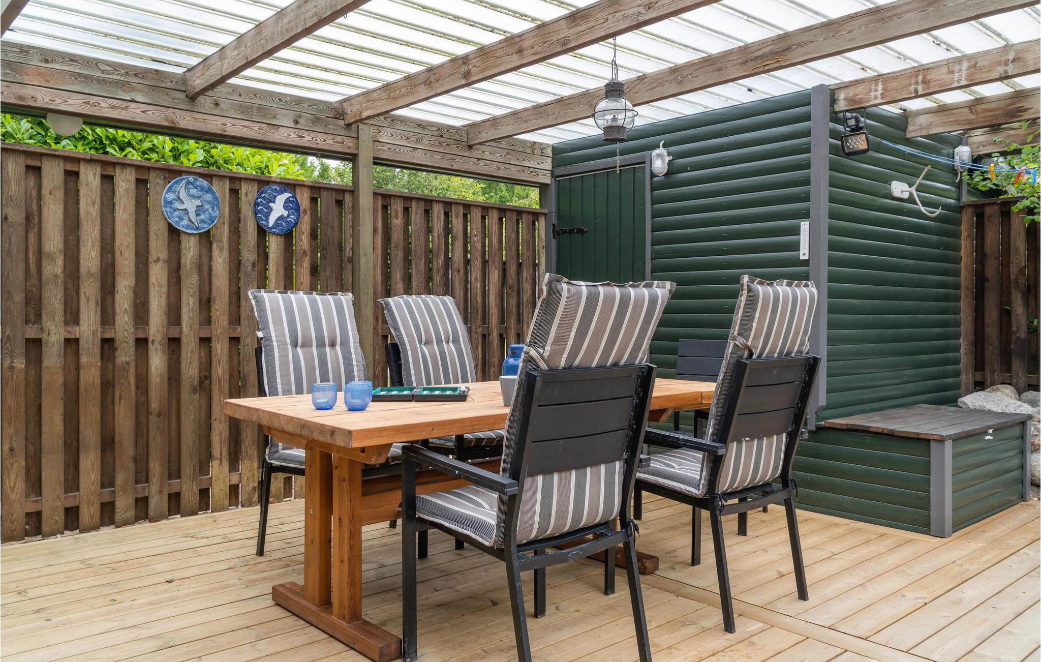Hyggeligt feriehus nær Nysted med overdækket terrasse og kort gåafstand til badestrand og havn.