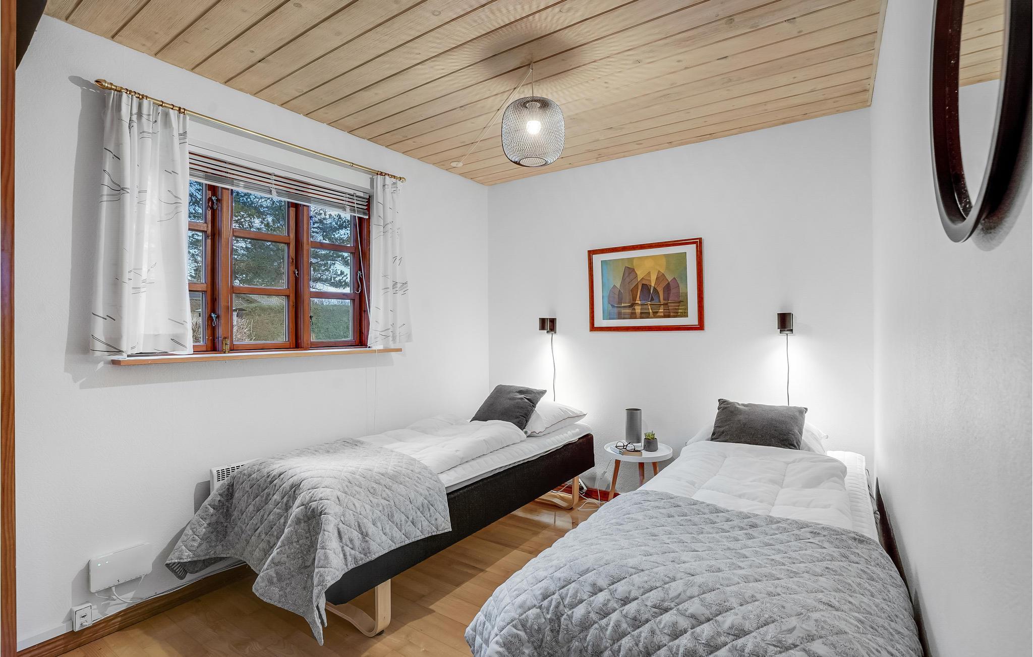 Det flotte træhus med sprossede vinduer har plads til seks personer. Tre af soveværelserne har henholdsvis dobbeltseng, to enkeltsenge og en køjeseng (den nederste del er 120 cm bred). Der er også en rummelig stue med åbent køkken, et badeværelse med varmtvandsbeholder på 110 liter og en garage til bilen. Huset får et skønt lysindfald gennem vinduerne, og I kan glæde jer til en dejlig udsigt over det omkringliggende grønne område.