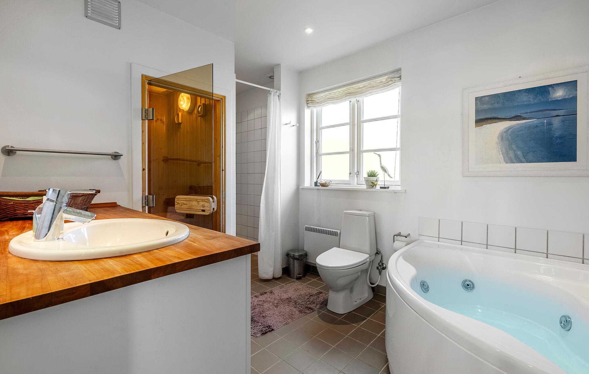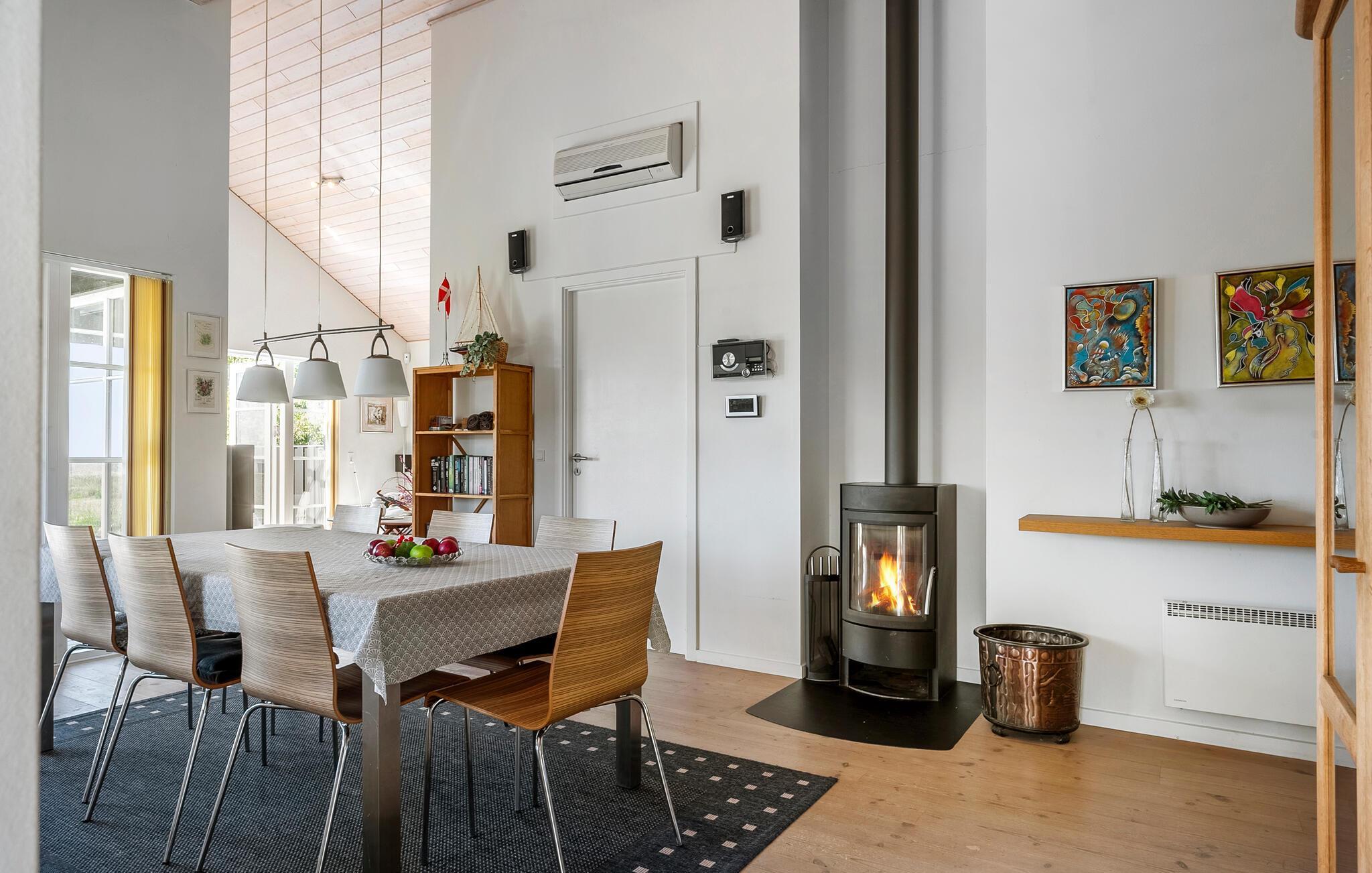 Tilbring jeres ferie i dette stilfulde feriehus, som emmer af ro og kan fremvise en fantastisk havudsigt. Her venter de bedste betingelser for at slappe af, lade batterierne op og nyde livet ved vandet. Træd ind i det lyse, åbne interiør med højt til loftet, indbydende indretningsløsninger og masser af naturligt lys. Sæt jer til rette i opholdsstuen, hvor der er en komfortabel sofa, TV og direkte adgang til terrassen. Brændeovnen sørger for hyggelig varme på kølige dage. Lav mad sammen i det rummelige køkken med træbordplader og moderne design og nyd jeres måltider ved spisebordet.