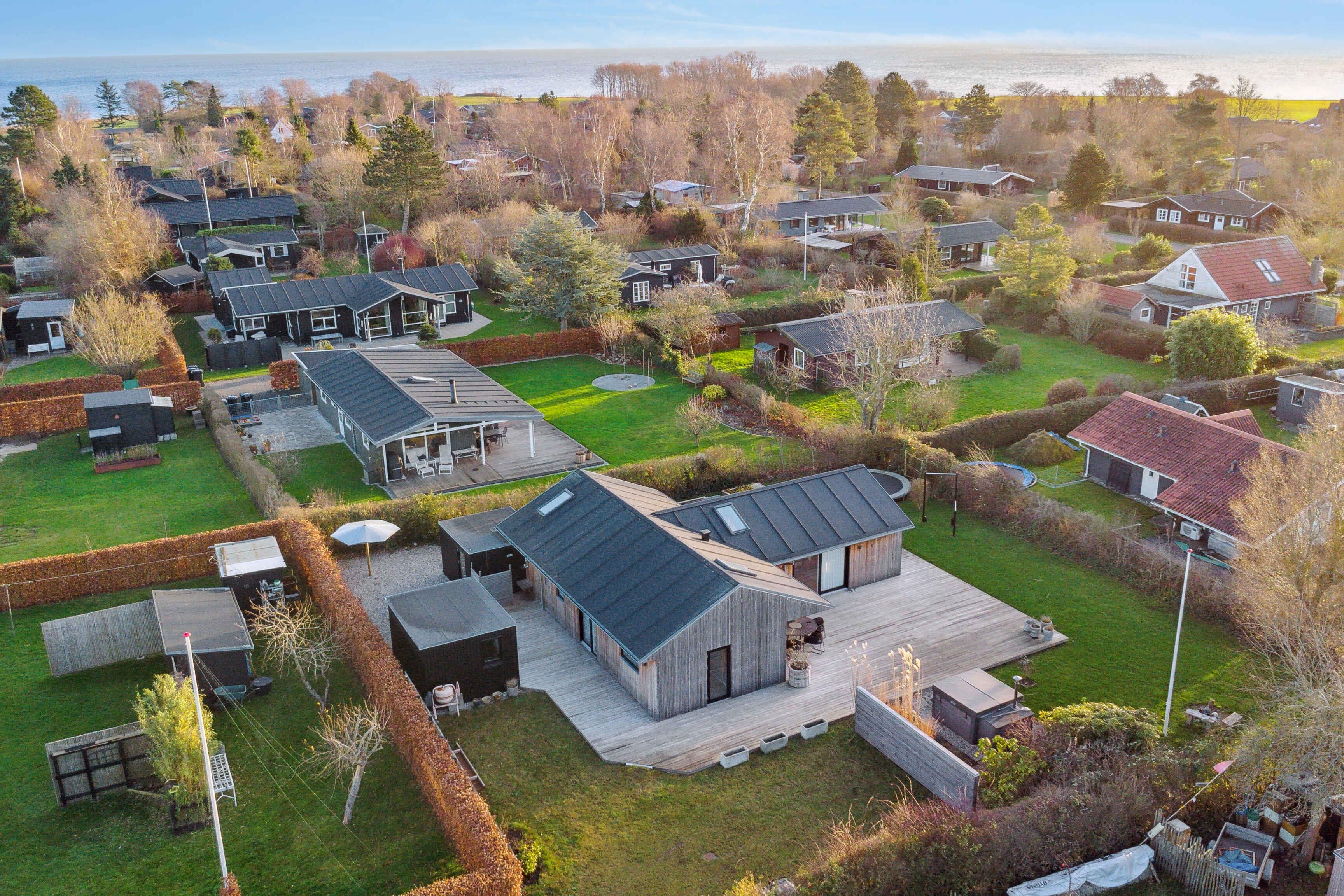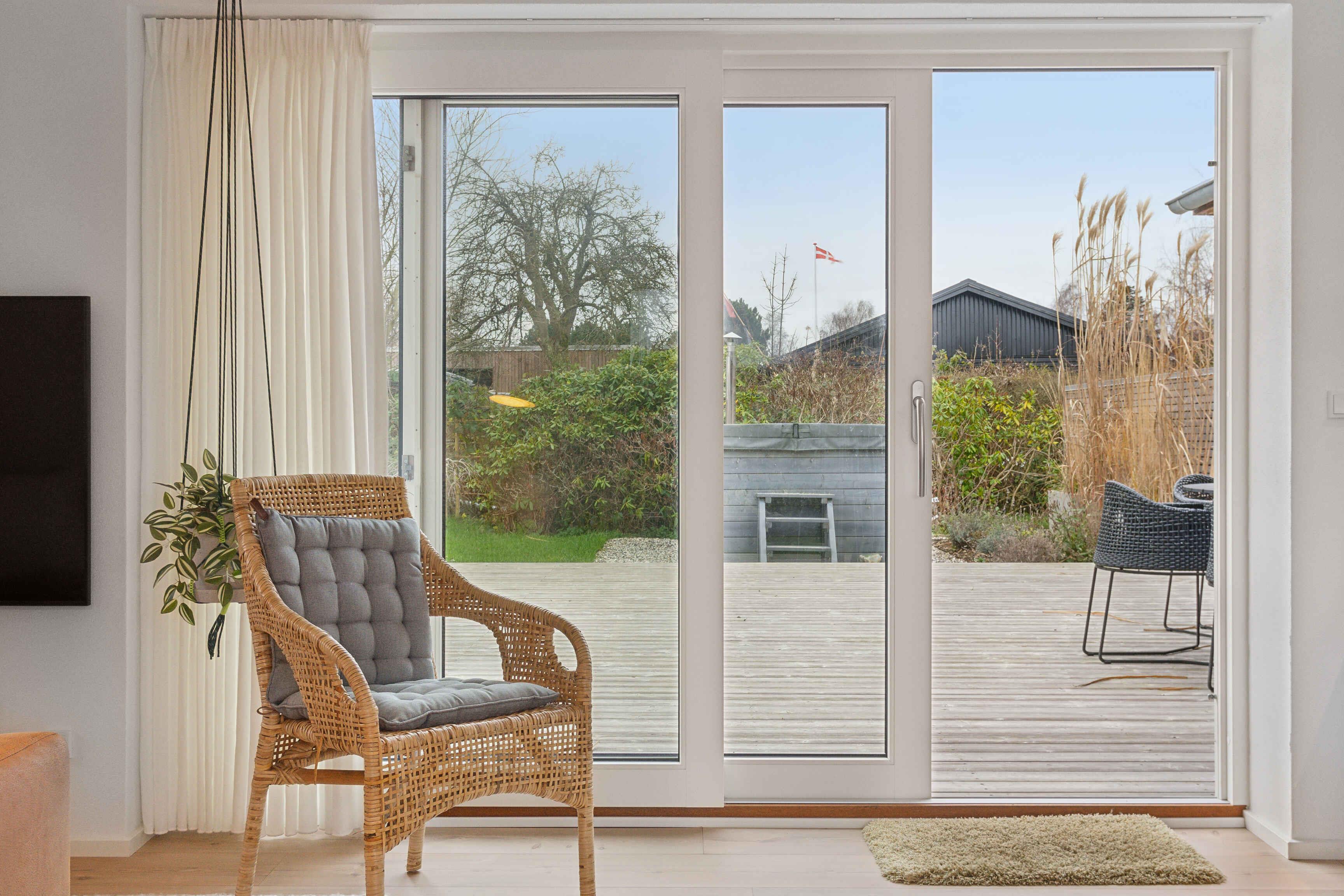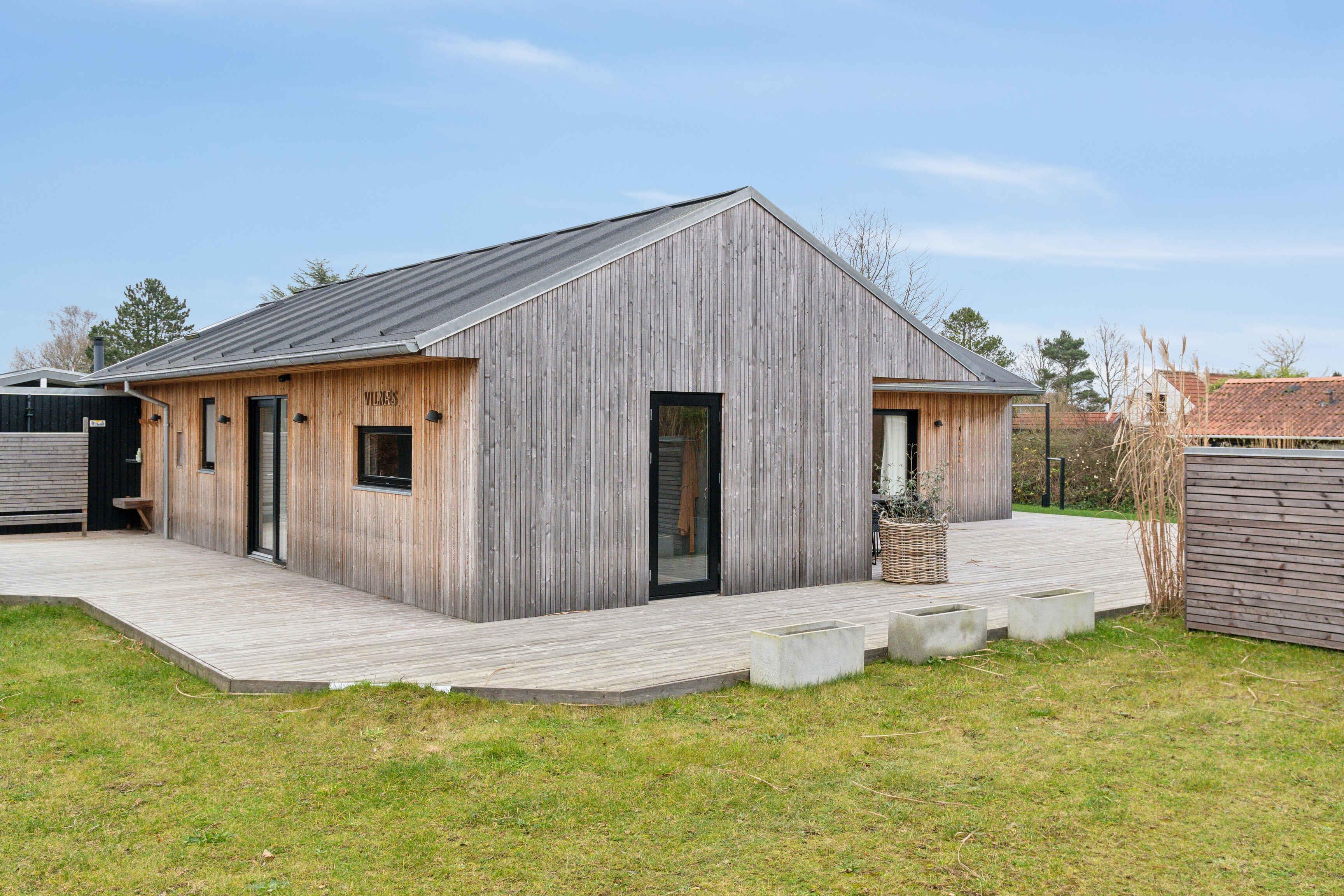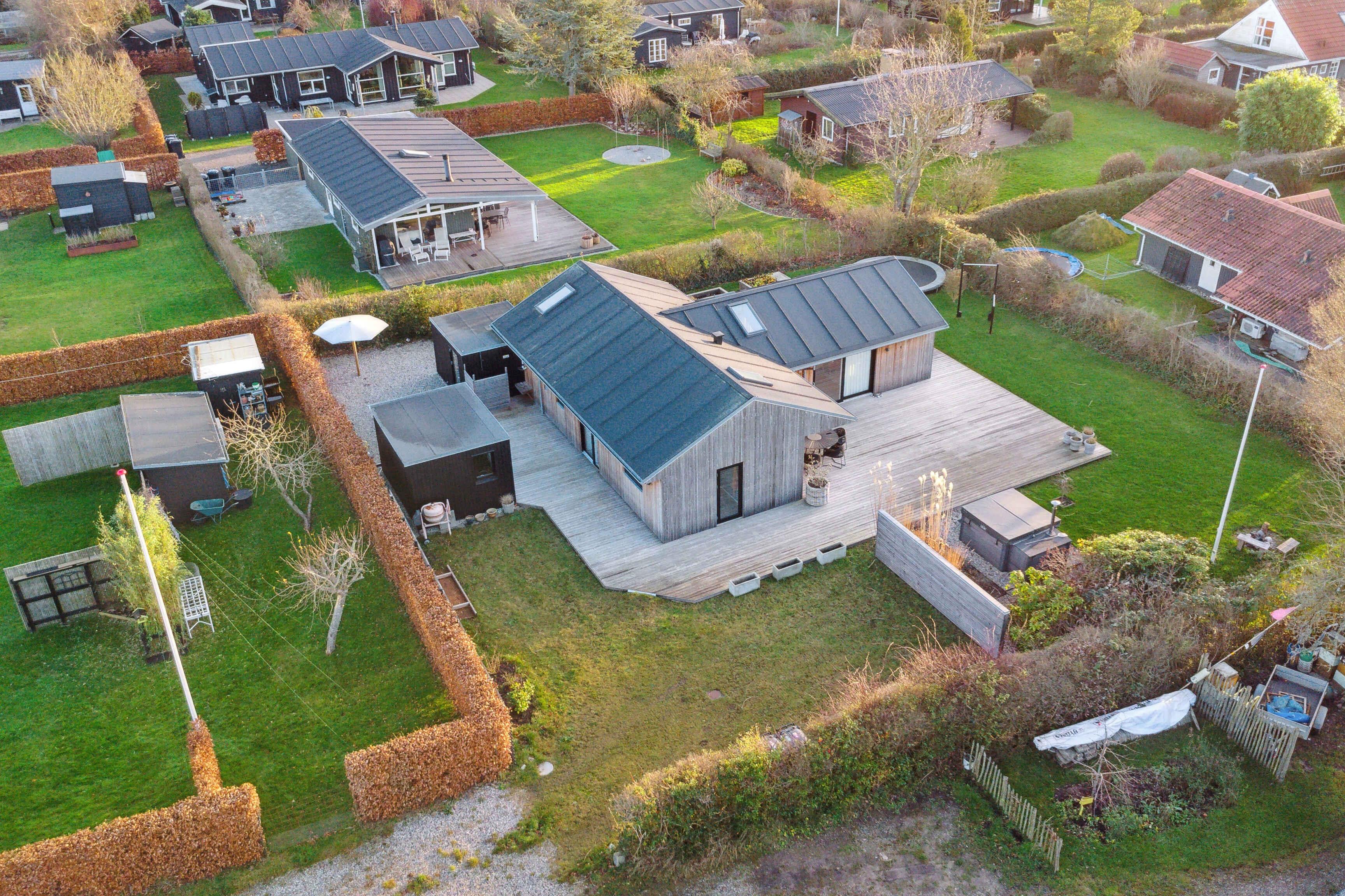 Rummeligt og naturskønt sommerhus i Odder med stor terrasse, vildmarksbad og legefaciliteter tæt på strand og havn.