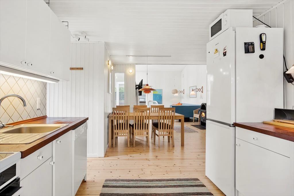 Køkken med diverse hvidevarer og udgang til terrassen.