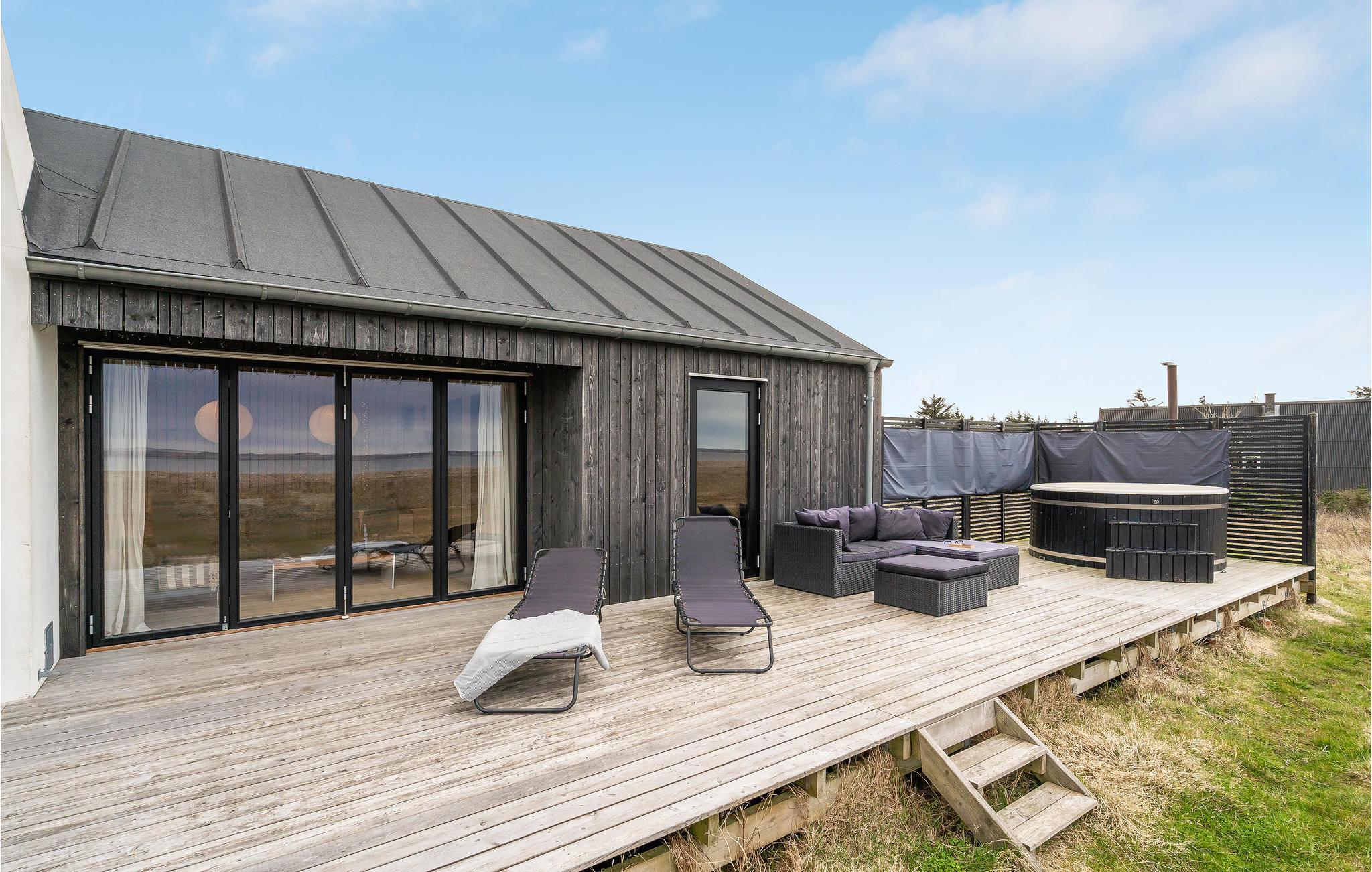 Dette stilfulde sommerhus venter jer i første række i klitterne, hvor I kan tilbringe en dejlig ferie med udendørs wellness og tæt på fjorden.