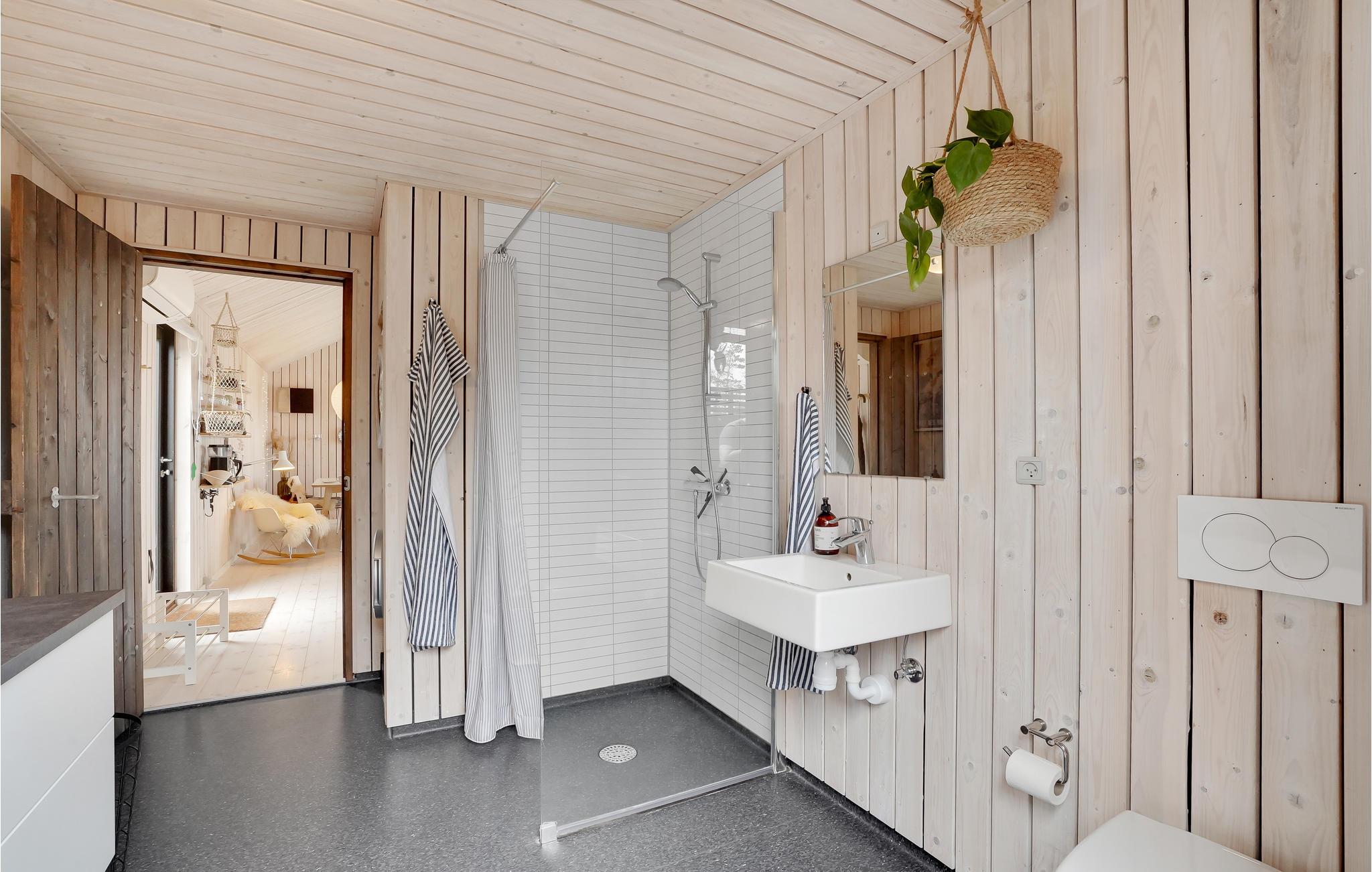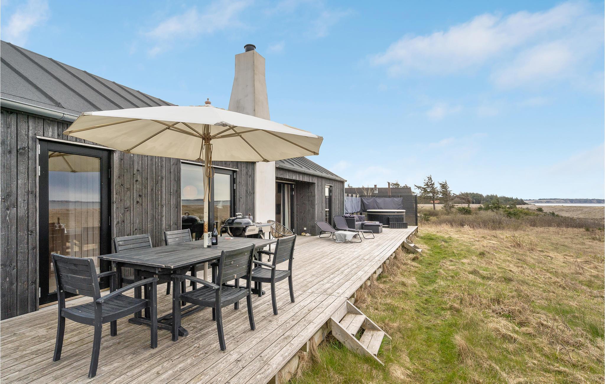 Herfra kan I også få adgang til den smukke træterrasse med havemøbler, som er ideel til lange aftener med et godt glas vin. Et højdepunkt er det finske træbad til 4 personer, hvor I kan slappe af med en kølig drink og udsigt over vandet. Foran huset er der en anden, overdækket terrasse.