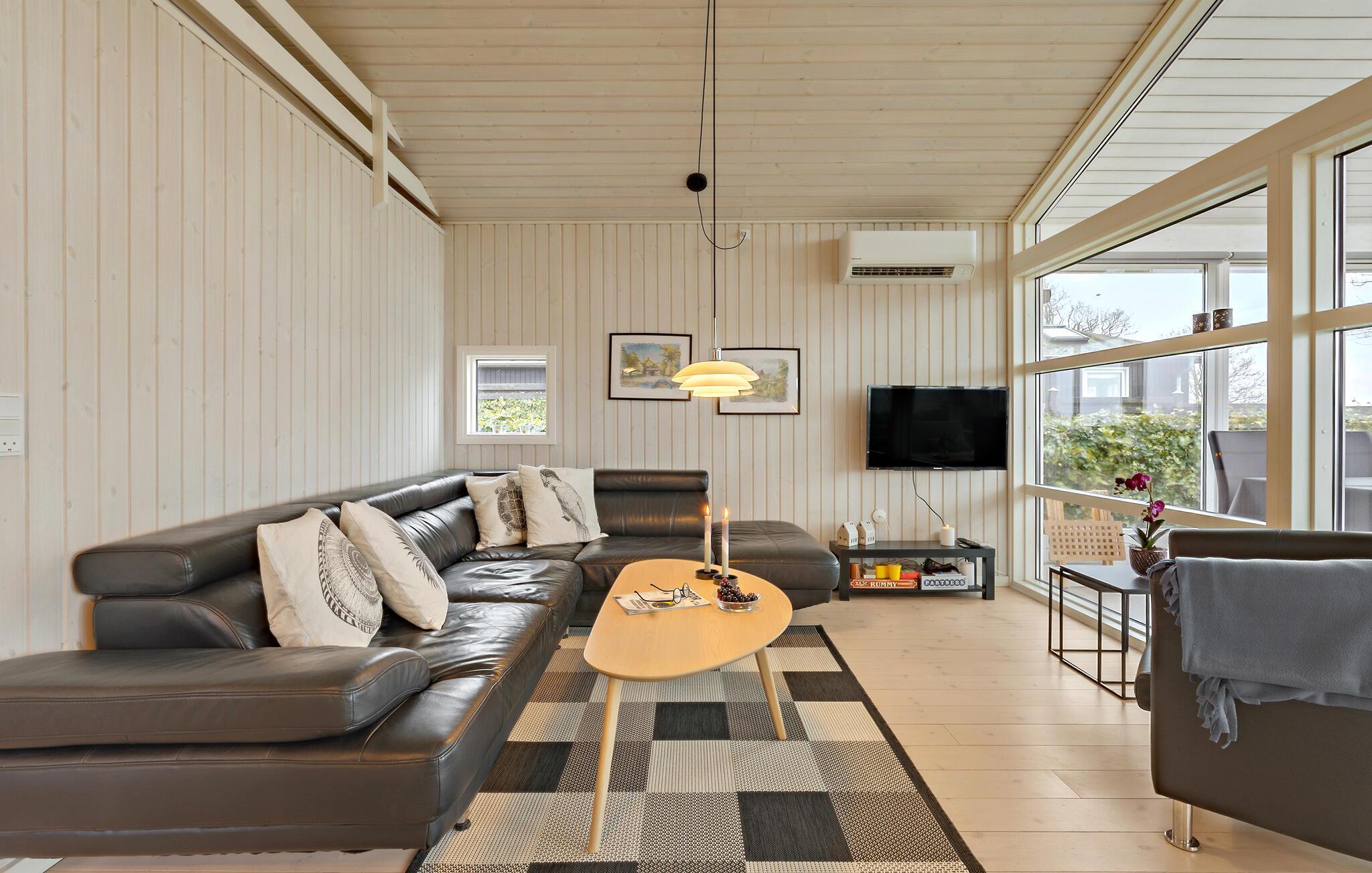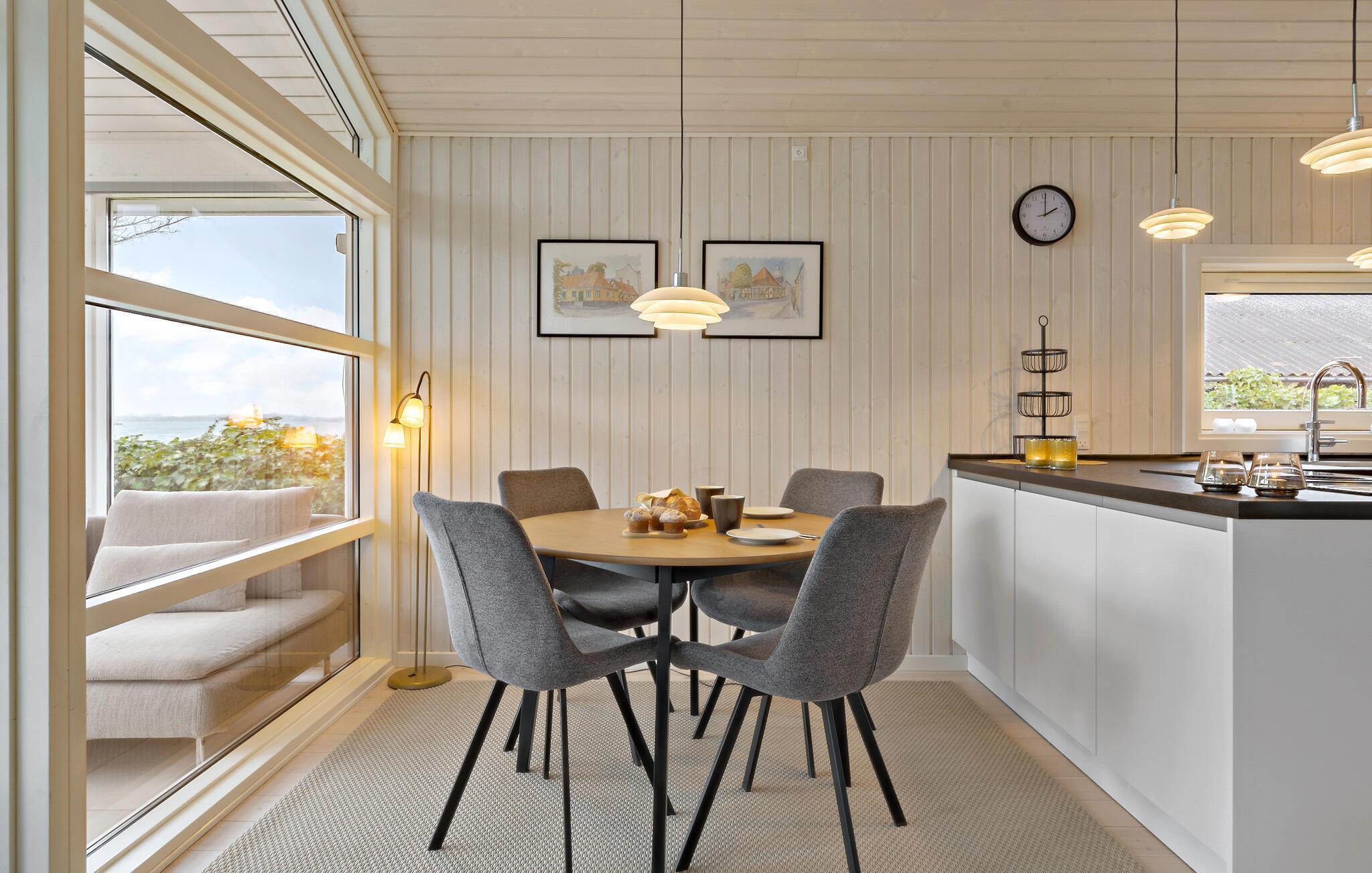 Lad hverdagen blive derhjemme og se frem til en afslappende ferie i dette indbydende og hyggelige træhus lige ved Kerteminde Fjord. Indretningen fremstår åben og rummelig, ikke mindst på grund af de store vinduespartier, der lader en masse naturligt lys sive ind og nærmest bringer de smukke omgivelser ind i den åbne stue, som ligger i forbindelse med køkkenet, og hvor der venter jer mange hyggelige stunder i familiens skød. Her kan I lave mad i det veludstyrede køkken, spille brætspil eller købe snacks ind til en underholdende filmaften. I udestuen får I en særligt god udsigt og et skønt sted at starte dagen ud med en friskbrygget morgenkaffe.