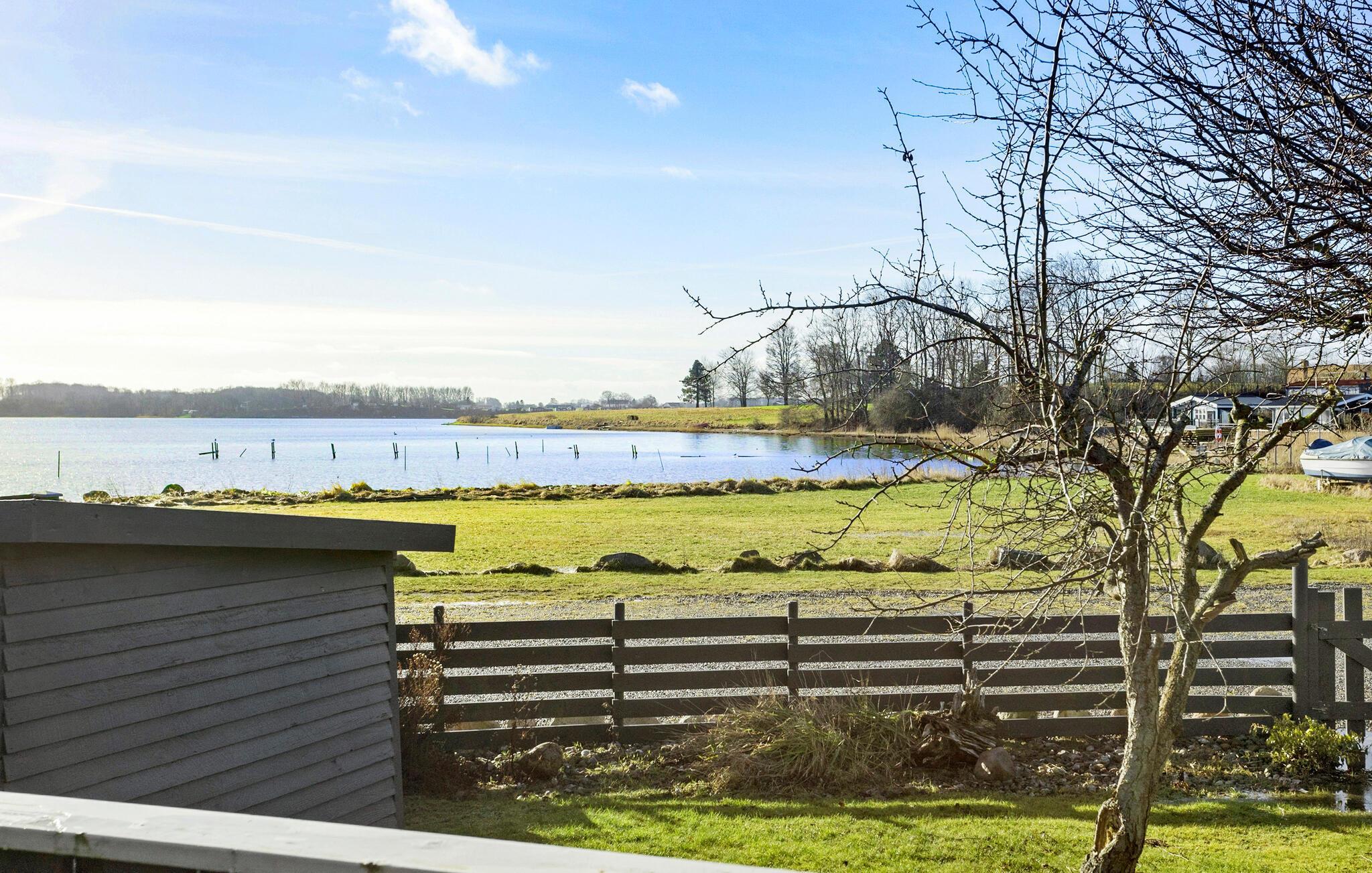 Charmerende træhus ved Kerteminde Fjord med panoramaudsigt, terrasse og have på begge sider.