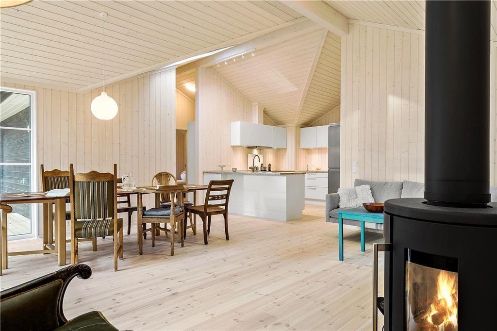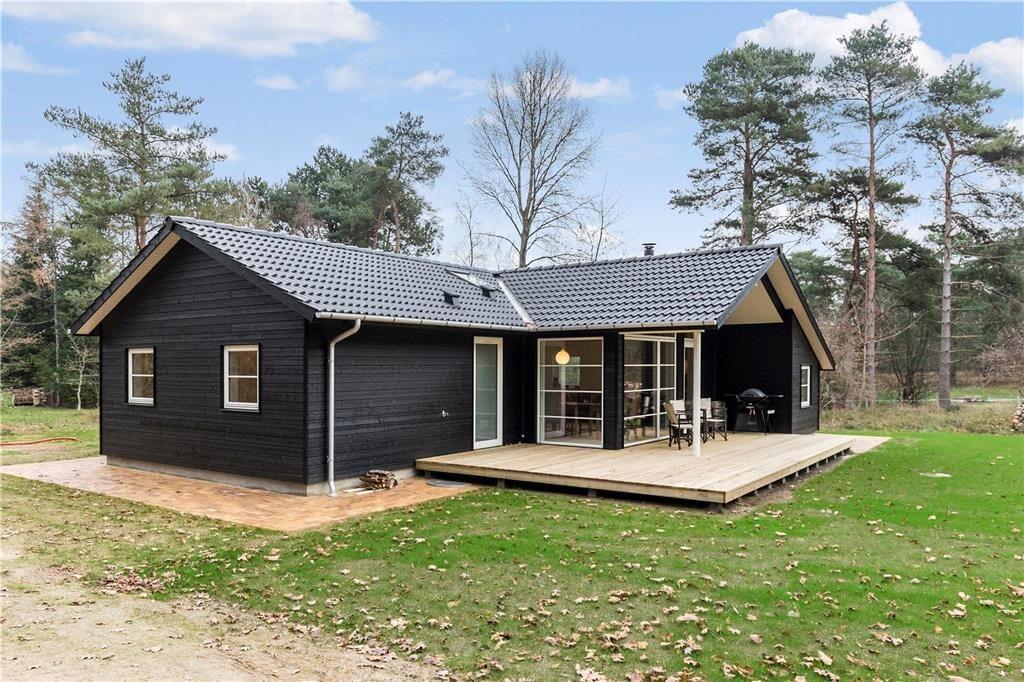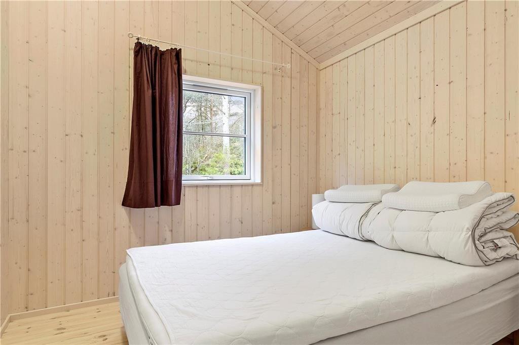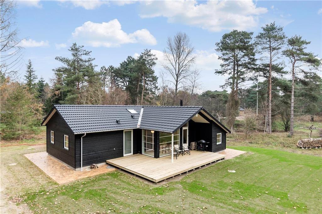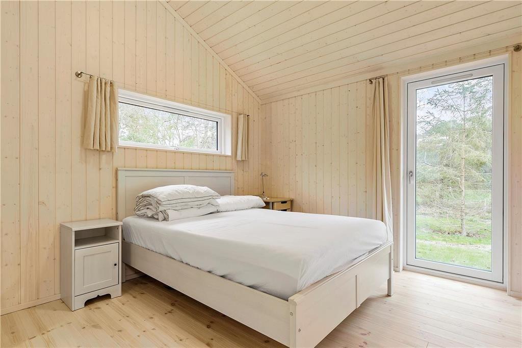 Huset indeholder stor stue med fantastisk lysindfald, TV, varmepumpe, alkove med dobbeltseng og store panoramavinduer ud til den store have, hvor rådyrene krydser jævnligt. Der er 4 gode soveværelser, hvoraf de 2 indeholder dobbeltseng, Et med en træk ud seng samt et med køjeseng og en madras på hemsen. Huset indeholder desuden flot nyt åbent køkken med opvaskemaskine. Begge badeværelser er med brus og toilet. Fra stuen er der udgang til den dejlige træterrasse, hvor I kan sidde i ly og læ og nyde en middag på grillen samt betragte det rige dyreliv.