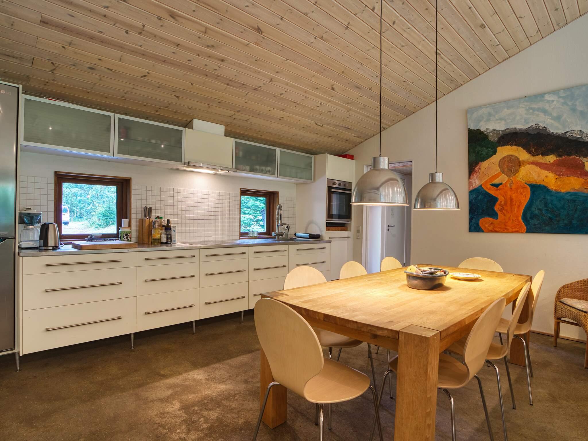 Huset har et veludstyret køkken og stue med spiseplads og en halvvæg, der adskiller rummet fra den hyggelige opholdsstue. Fra stuen er der store vinduer med dejlig udsigt over den omkringliggende grund og den nærliggende skov, hvor man ofte kan se rådyr på deres daglige gåture. Fra stuen er der direkte udgang til en 12 m² stor overdækket terrasse, som er det perfekte sted at slappe af. En ekstra åben terrasse langs huset, der blev færdiggjort i 2022, er ideel til at nyde solen på en fredelig dag. Der er en trampolin til rådighed i haven til sjov (brug på eget ansvar/forsikring). Ejendommen ligger kun 2 minutters gang fra sandstranden, hvilket gør det nemt at nyde kystmiljøet.