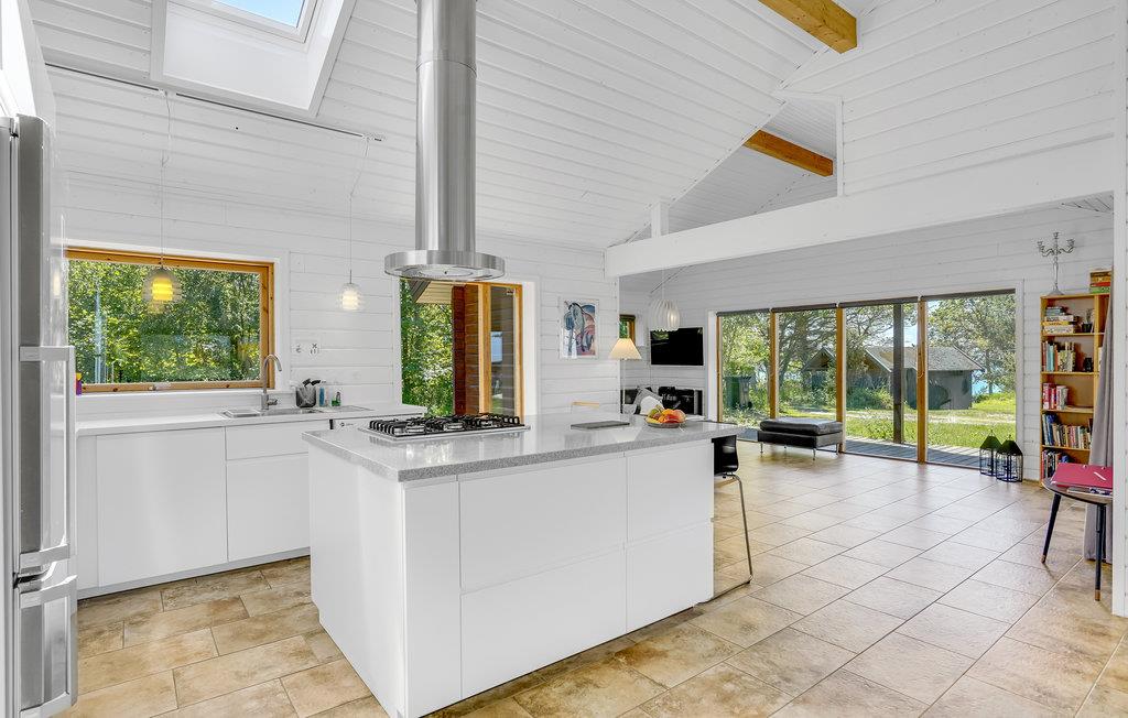 Fra stuen udgang til både åben som overdækket terrasse, hvor solen og udsigten til vandet kan nydes i fulde drag.