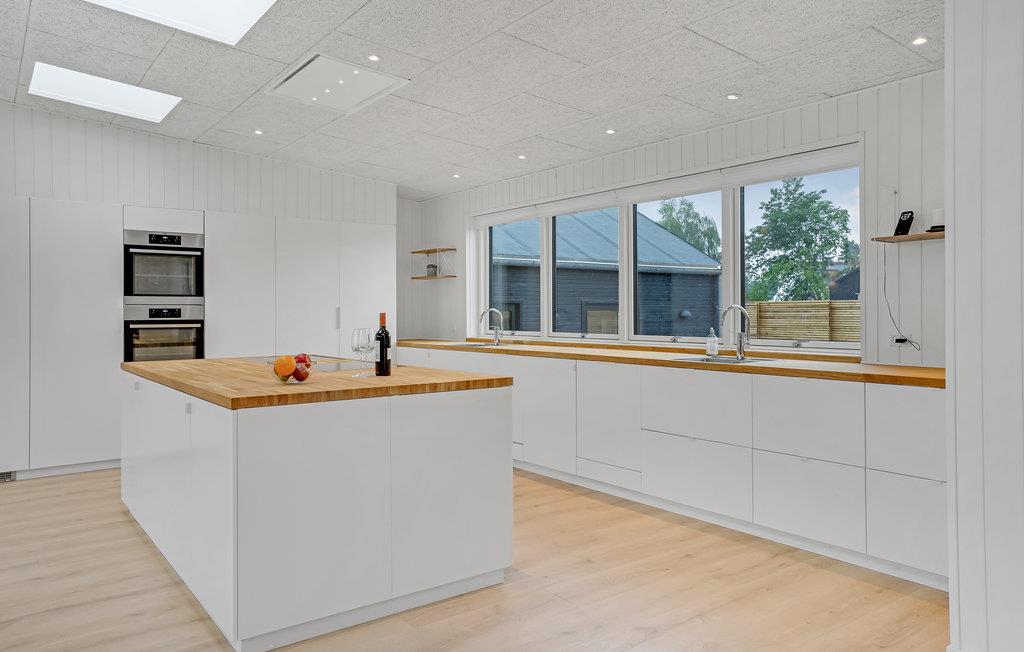 Køkkenet er veludstyret og dimensioneret til husets størrelse med bl.a. to komfurer, 2 ovne og to opvaskemaskiner. Endvidere rummer huset hele tre badeværelser med brus og et separat baderum med to brusere.