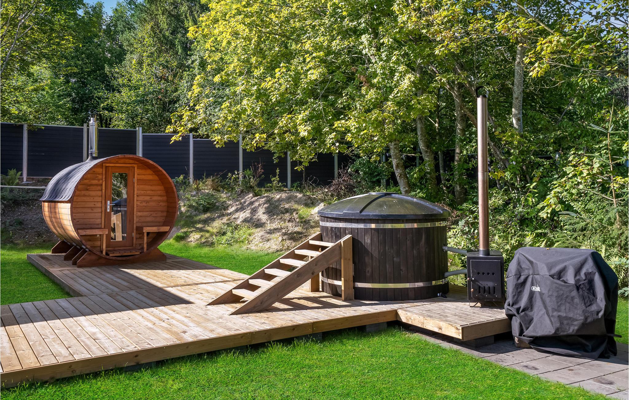 Fra alrummet er der direkte adgang til en stor ugeneret terrasse og mulighed for at opfylde jeres wellness-drømme, for her er der bl.a. saunatønde, vildmarksbad og udebruser. På regnvejrsdage kan I vælge den store indendørspool, hvor I kan tilbringe mange sjove timer sammen.