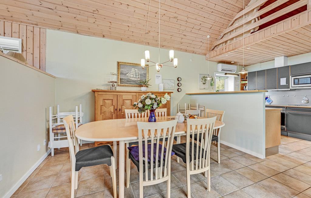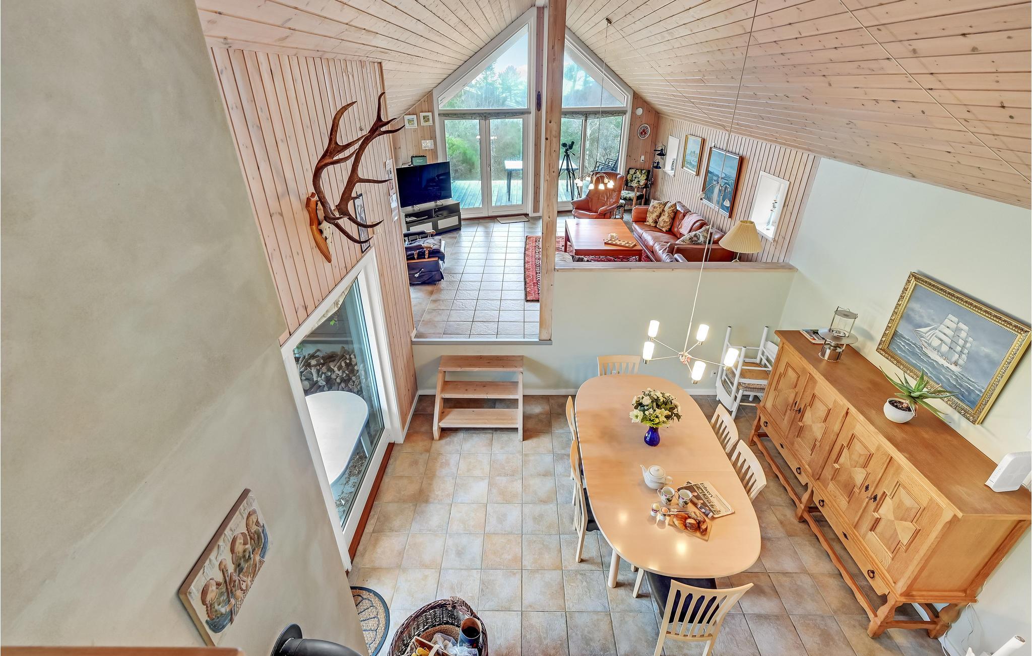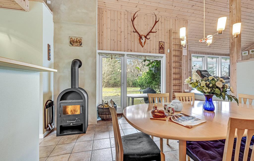 Husets hjerte er stuen med flere afdelinger, der indbyder til afslapning. Åbent til kip i kombination med trævægge- og loft og store vinduespartier skaber en rummelig og hyggelig atmosfære. Her kan I bl.a. flade ud til en god film på den store fladskærm eller tænde op i brændeovnen efter en frisk gåtur ved vandet.