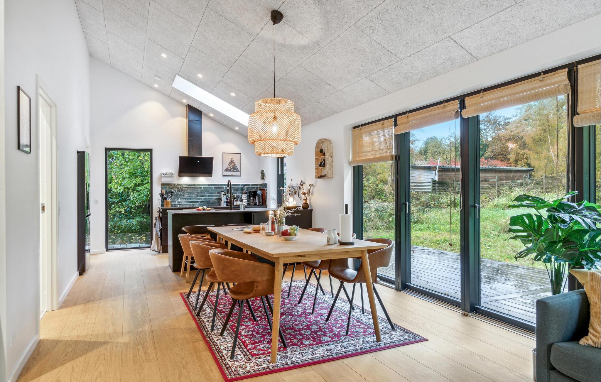 Sæt hverdagen på pause og nyd nogle dejlige dage med familien i Odsherred. Her venter denne skønne bolig, som emmer af flotte designløsninger, komfort, lys og luft. De store vinduespartier får ude og inde til at smelte sammen og skaber dejlige rammer til dagens måltider og små afslapningsstunder. I haven er der gode rammer til, at børnene kan boltre sig og hoppe i trampolin, mens de voksne kan sætte sig med en bog og nyde solen på terrassen.