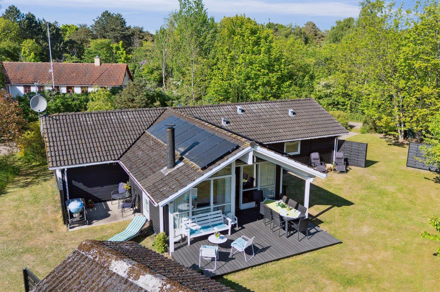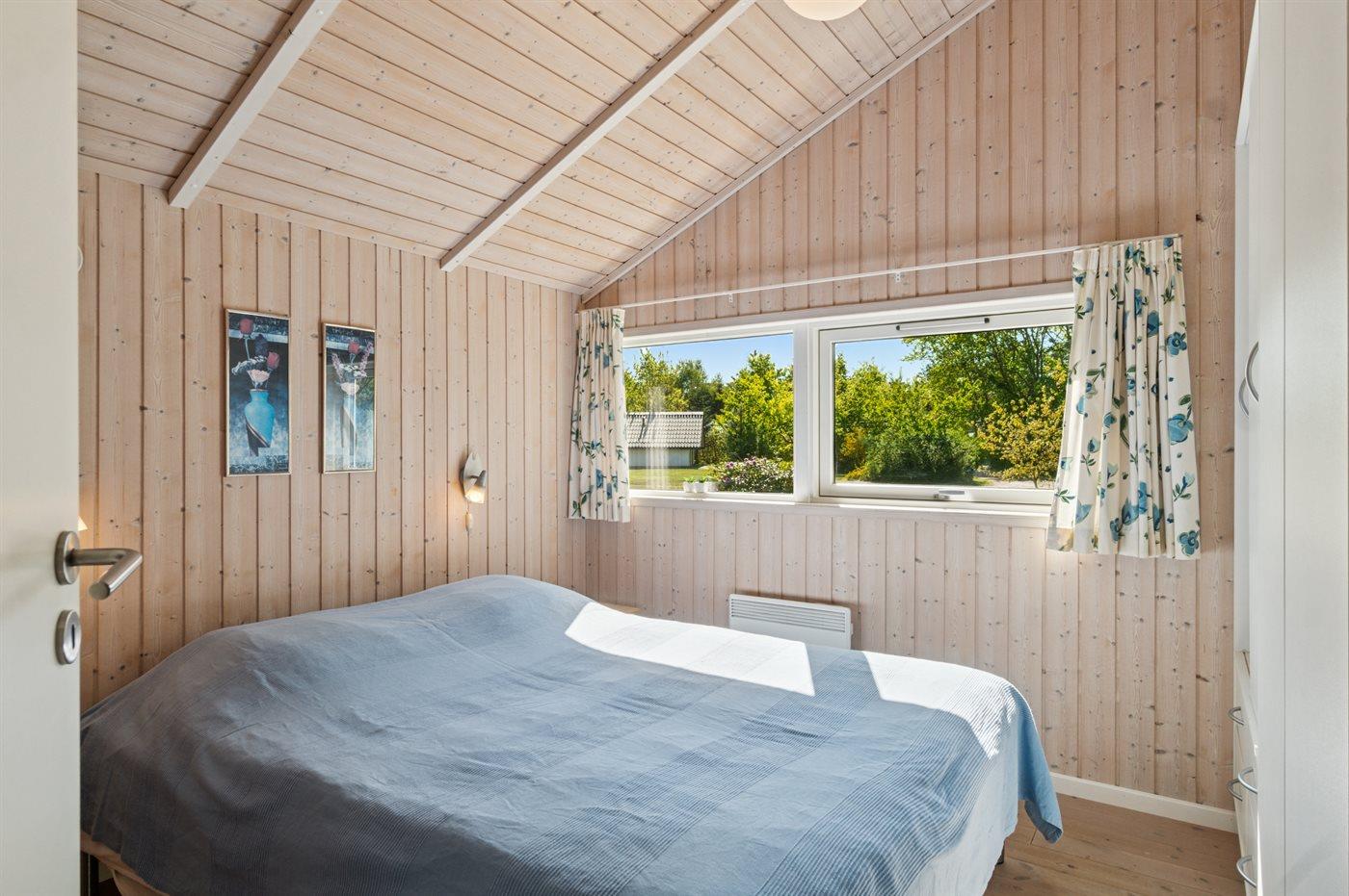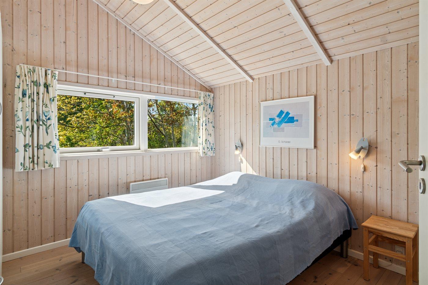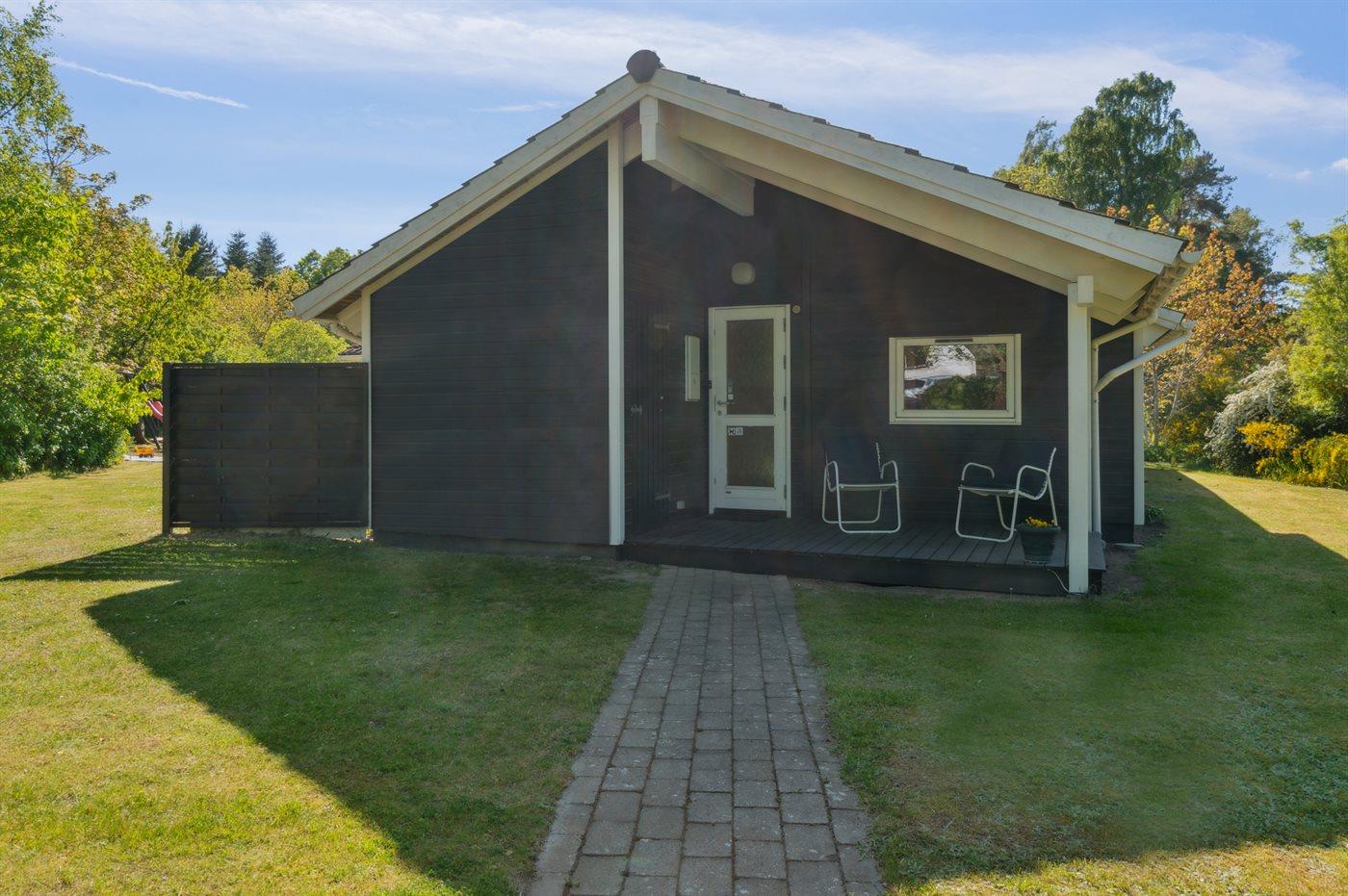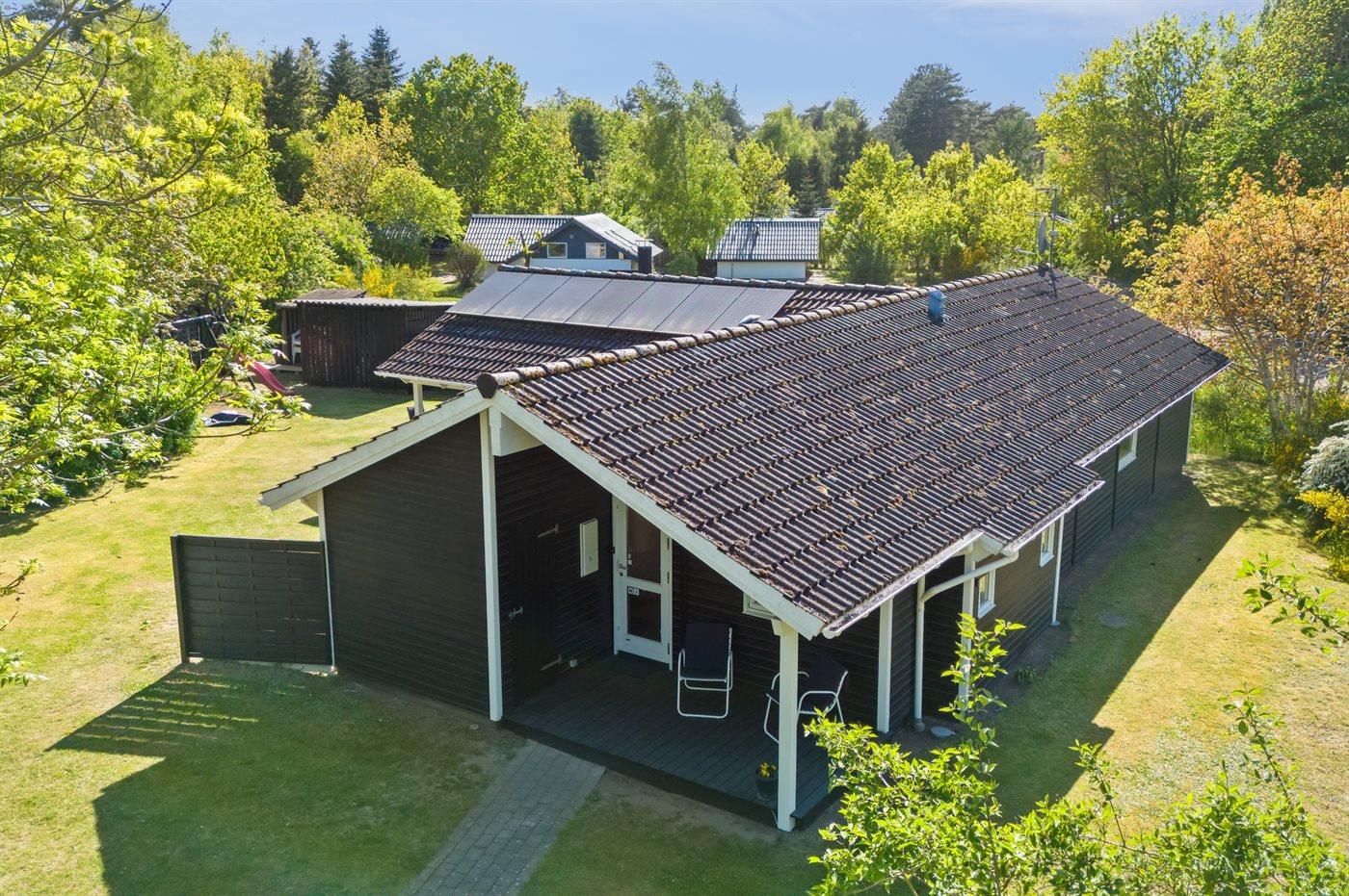 På en naturgrund blot 250 m fra stranden ligger dette dejlige sommerhus i træ med spa og sauna, bygget i 2002. Til huset hører såvel åben som overdækket terrasse med havemøbler. Webergrill står til rådighed. Indvendigt er der lyse trægulve. Huset er indrettet med 2 badeværelser med bruser. Det ene er yderligere udstyret med gulvvarme, 3-pers. spa og sauna. Moderne åbent køkken i forbindelse med stuen med bl.a. fryser, opvaskemaskine, mikrobølgeovn, komfur med keramiske kogeplader og varmluftovn. Lys opholdsstue med brændeovn, TV, Chromecast, DVD-afspiller samt stereoanlæg med CD-afspiller. Der er Ingen TV-kanaler – kun mulighed for streaming. Hvis man har et Viasat-kort derhjemme, kan man tage det med til sommerhuset. Desuden ekstra TV med indbygget DVD-afspiller på børneværelset. Husets 8 sovepladser er fordelt på 4 soverum; 3 med dobbeltseng og 1 med køjeseng. Af yderligere udstyr kan gratis, trådløs internetforbindelse (computer skal medbringes), vaskemaskine samt tørretumbler nævnes og der er installeret en energibesparende varmepumpe. Til de små feriegæster er der barneseng, høj barnestol, gynge, rutchebane og sandkasse.