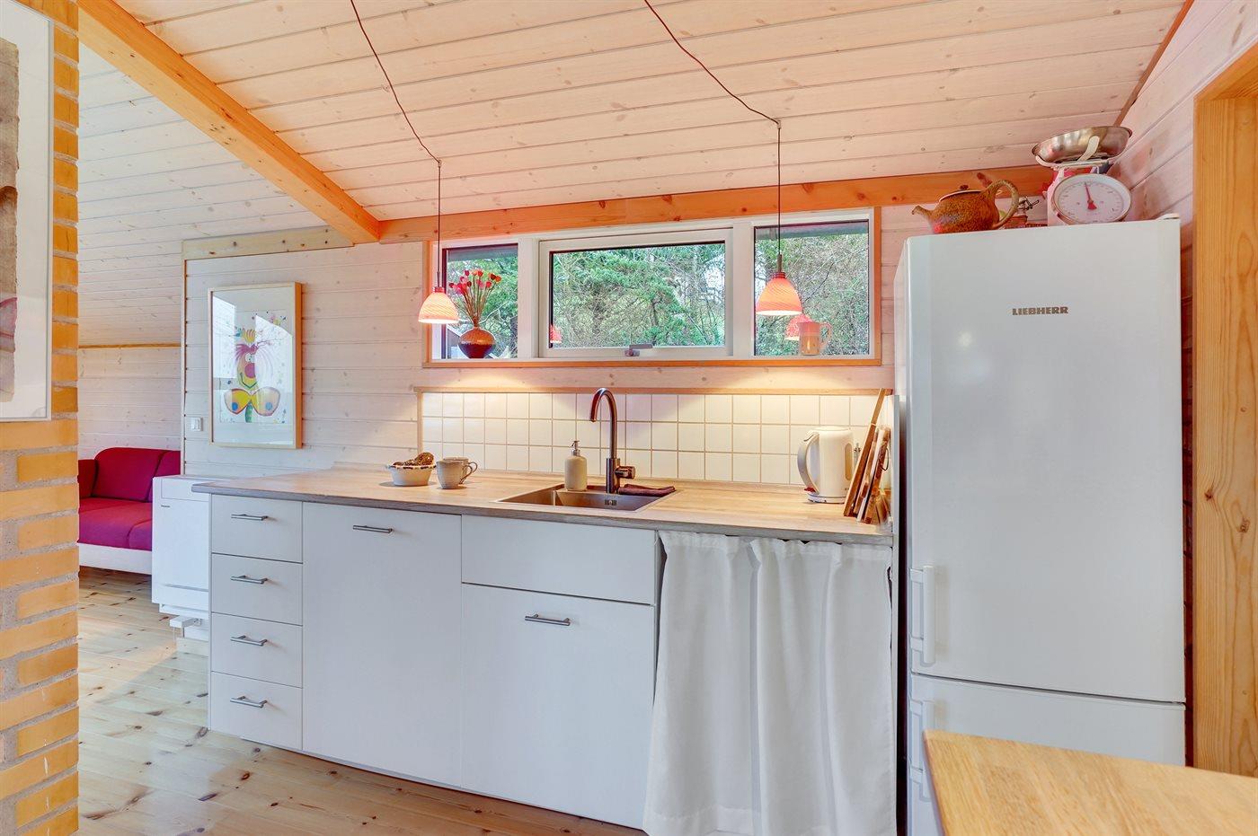 Køkkenet er udstyret med 1 køleskab. Der er 4 keramiske kogeplader, varmluftovn, mikrobølgeovn samt opvaskemaskine.