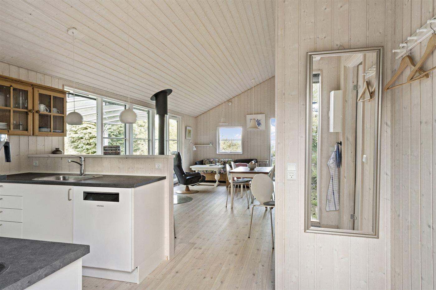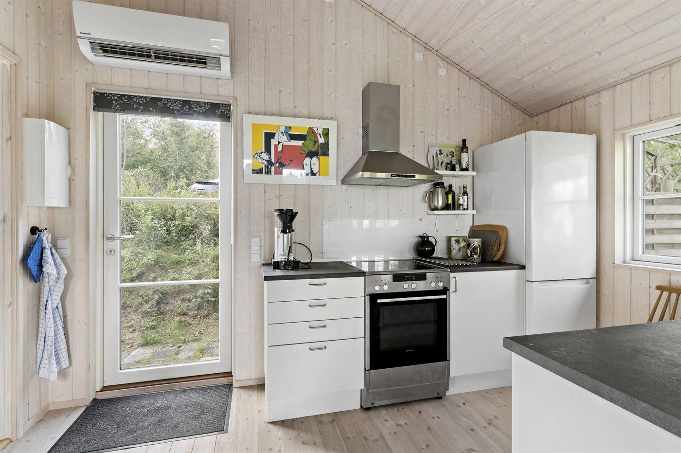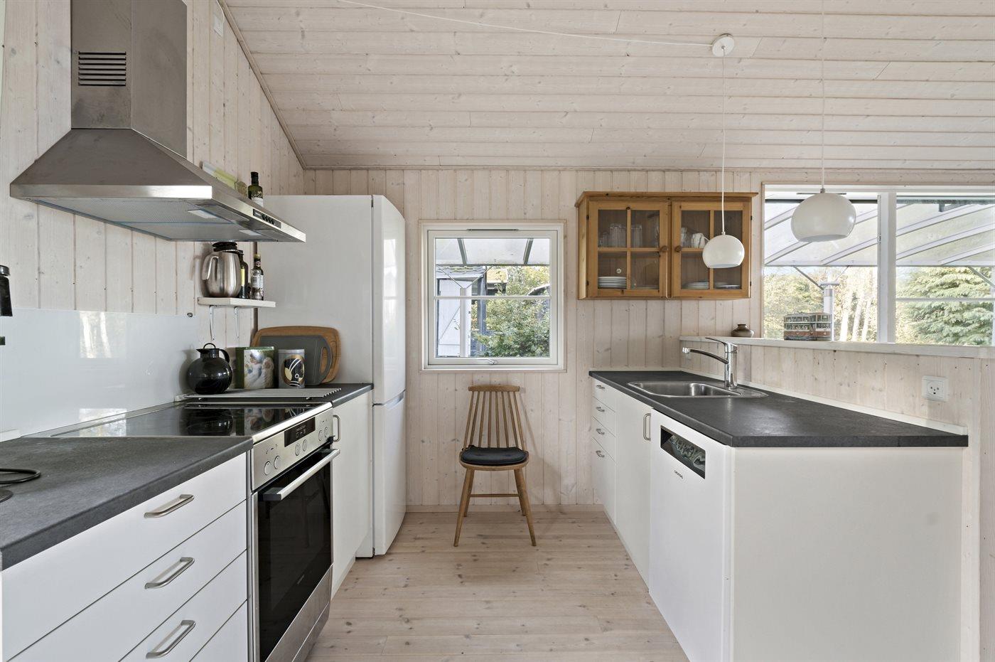 Køkkenet er udstyret med 1 køleskab. Der er 4 keramiske kogeplader, varmluftovn samt opvaskemaskine.