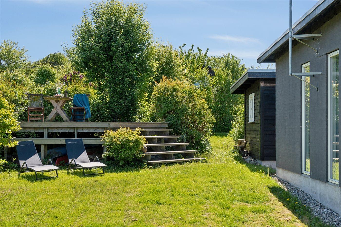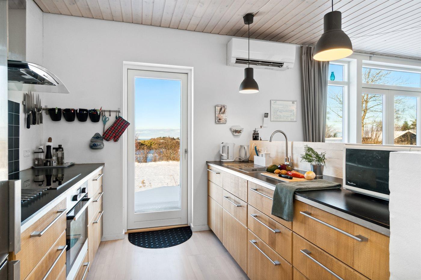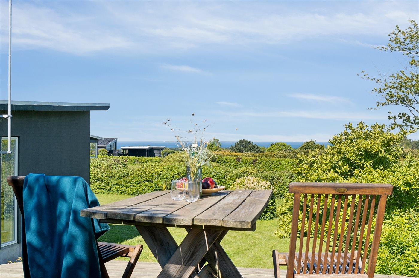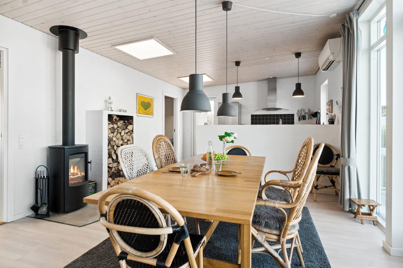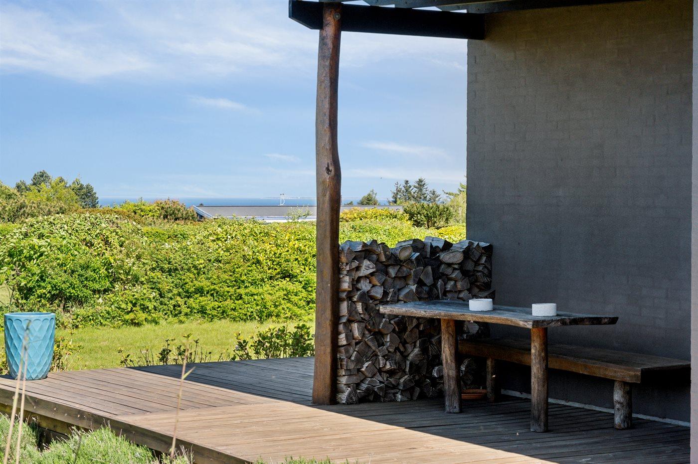 Fra det hyggelige og lyse køkken-alrum og fra stuen med tagvinduer og brændeovn er der udgang til den nordvestvendte og delvist overdækkede træterrasse. På den modsatte side af huset findes der en dejlig terrasse med masser af læ og i hjørnet af grunden er der en hævet træterrasse, hvorfra der er flot udsigt over området og havet.