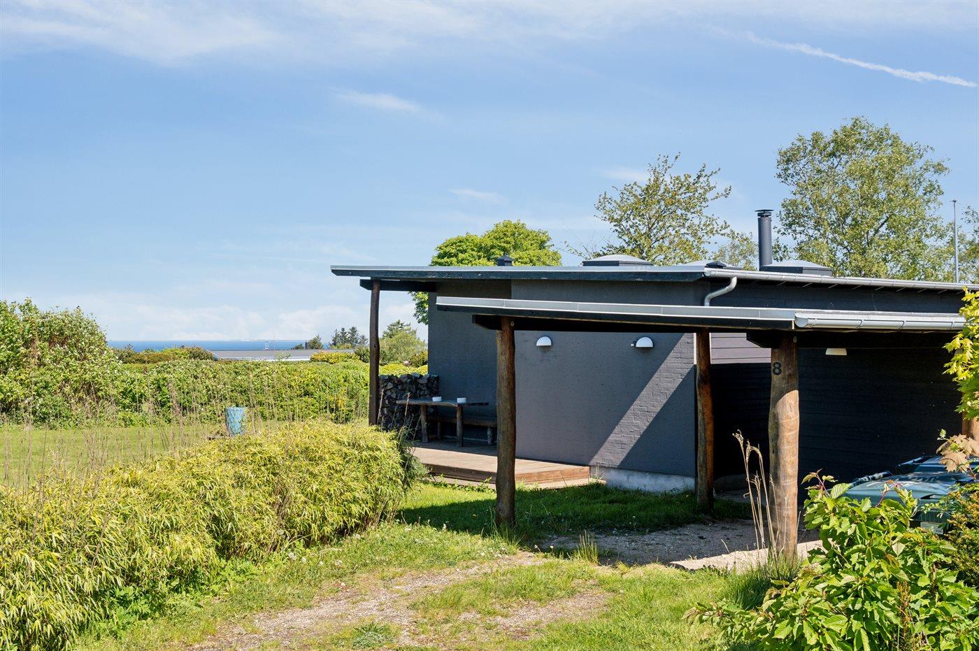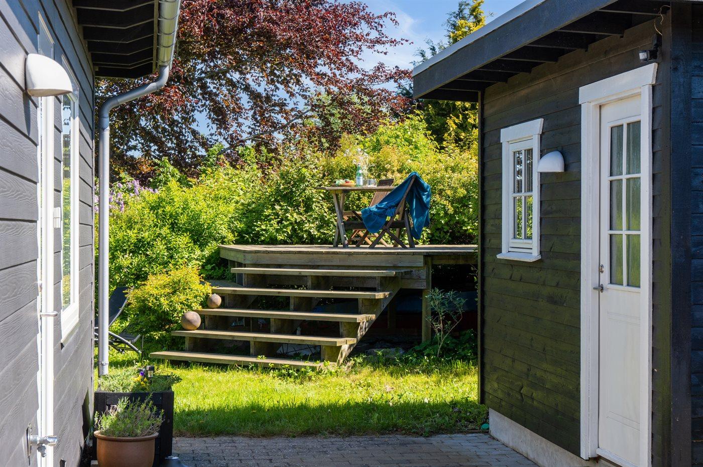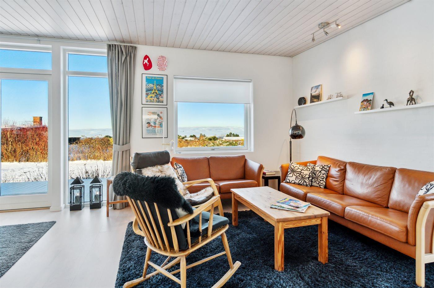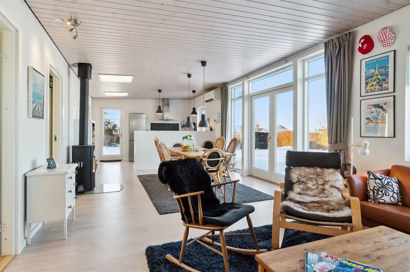 Fra det hyggelige og lyse køkken-alrum og fra stuen med tagvinduer og brændeovn er der udgang til den nordvestvendte og delvist overdækkede træterrasse. På den modsatte side af huset findes der en dejlig terrasse med masser af læ og i hjørnet af grunden er der en hævet træterrasse, hvorfra der er flot udsigt over området og havet.