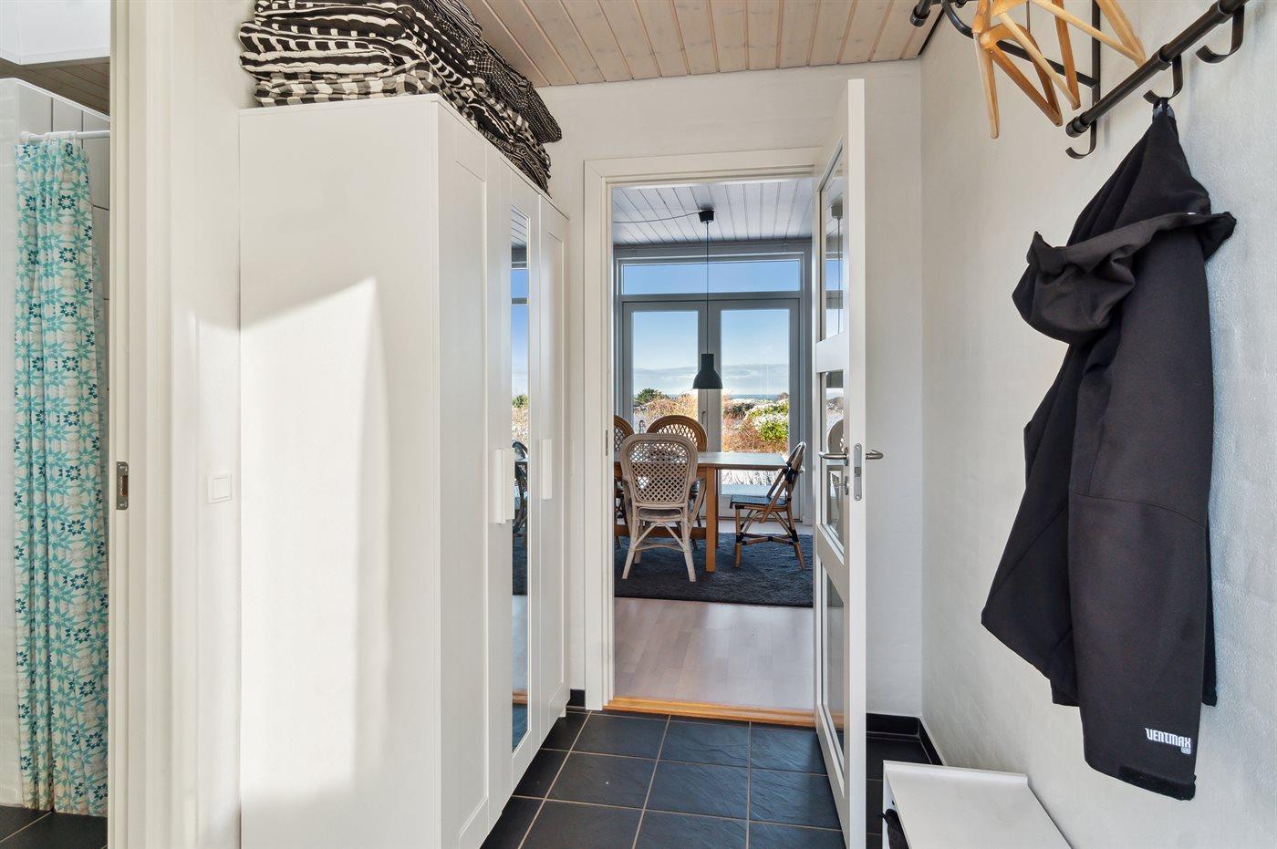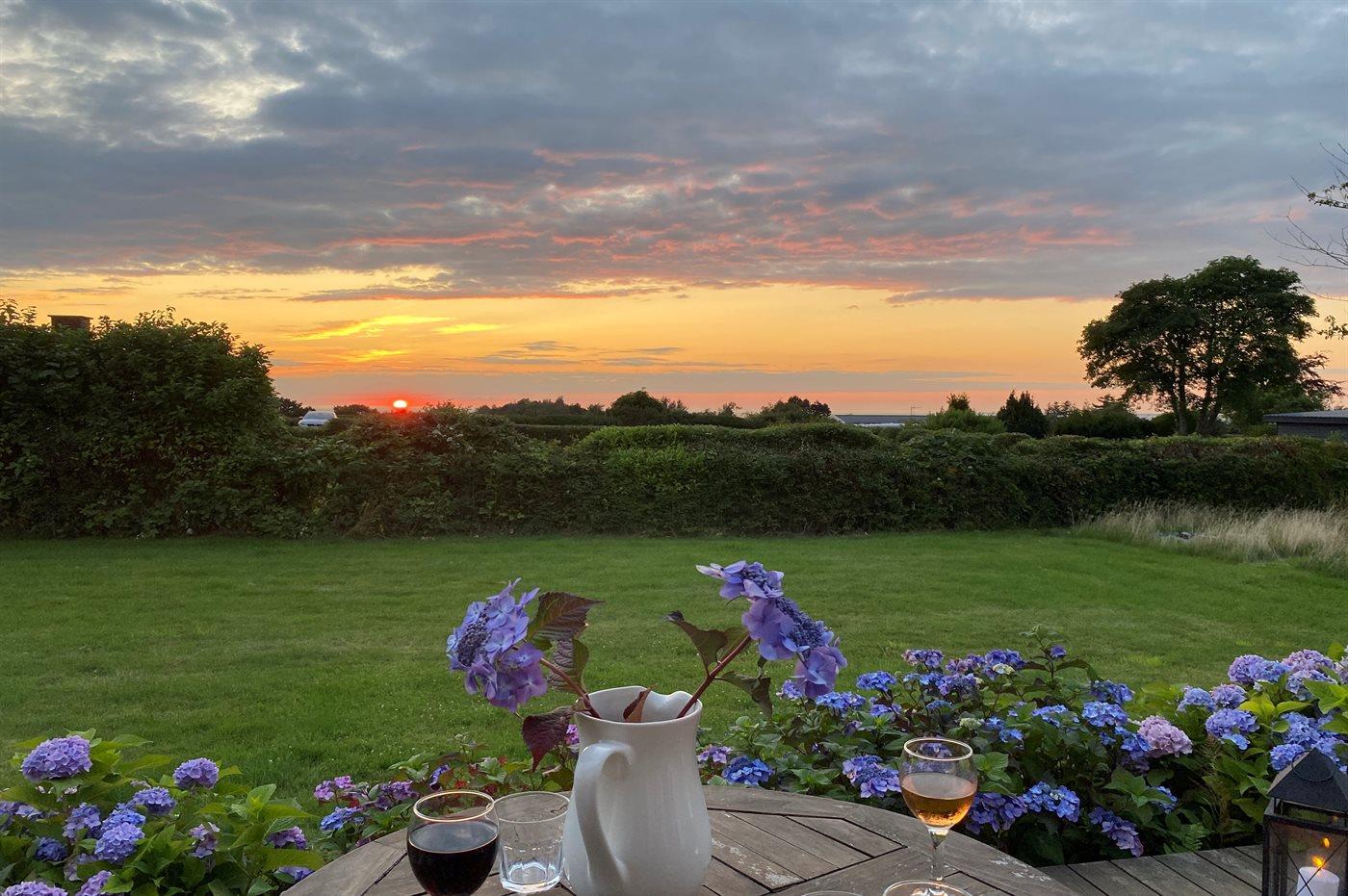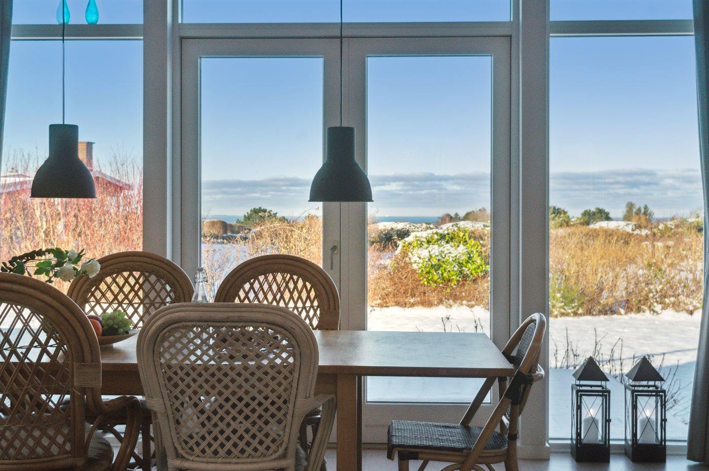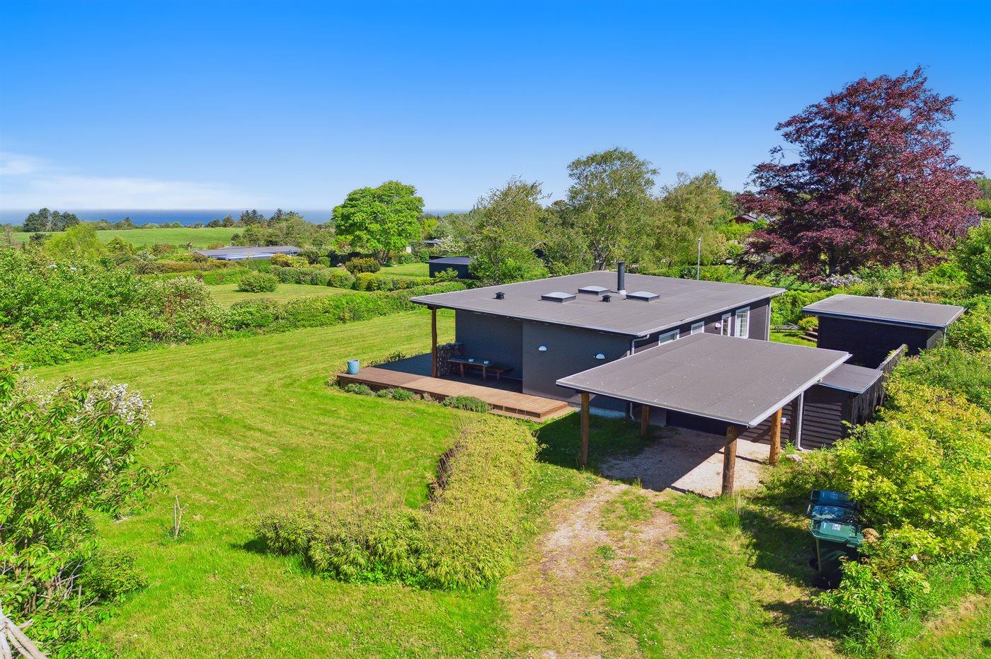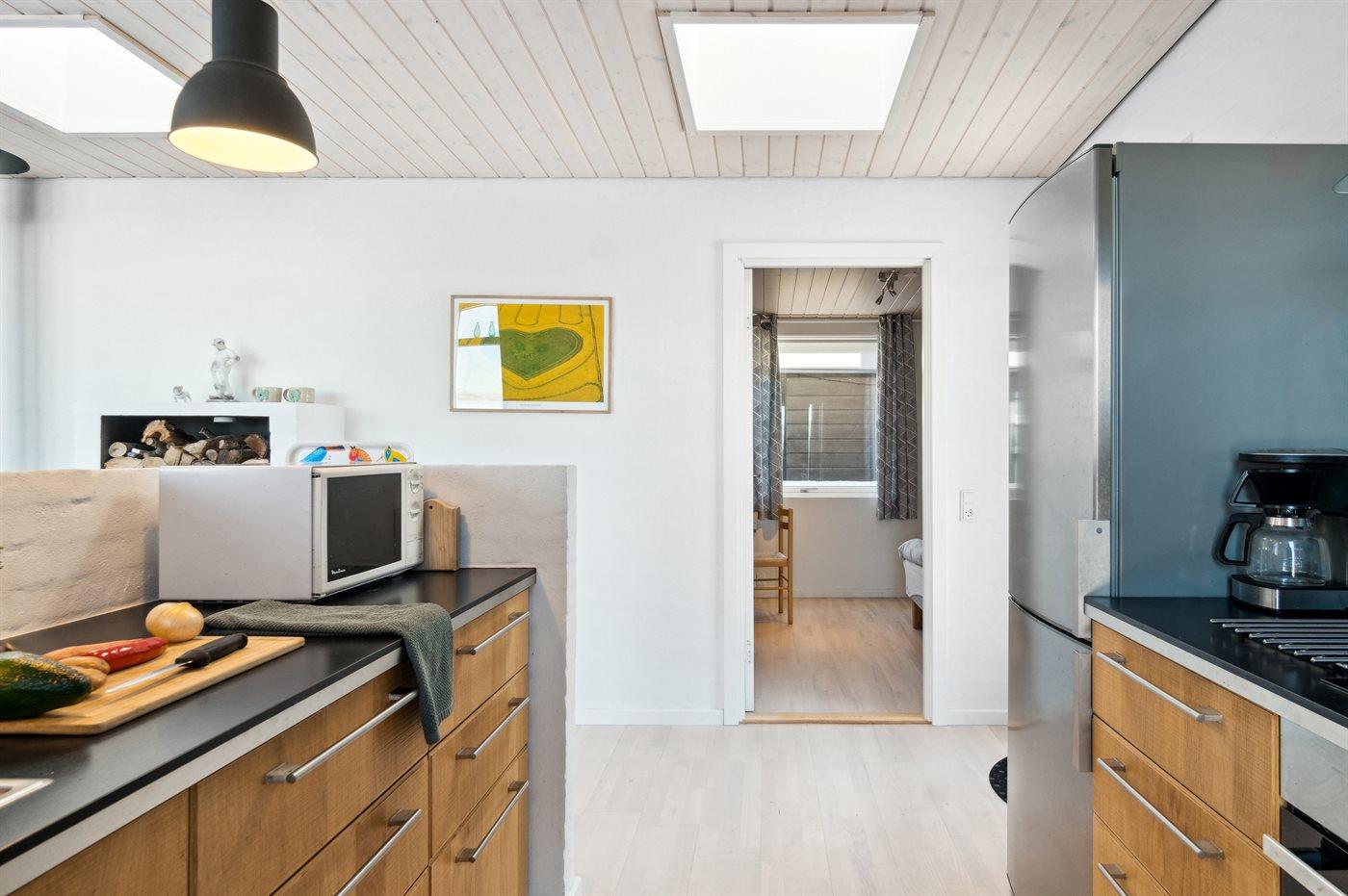 Fra det hyggelige og lyse køkken-alrum og fra stuen med tagvinduer og brændeovn er der udgang til den nordvestvendte og delvist overdækkede træterrasse. På den modsatte side af huset findes der en dejlig terrasse med masser af læ og i hjørnet af grunden er der en hævet træterrasse, hvorfra der er flot udsigt over området og havet.