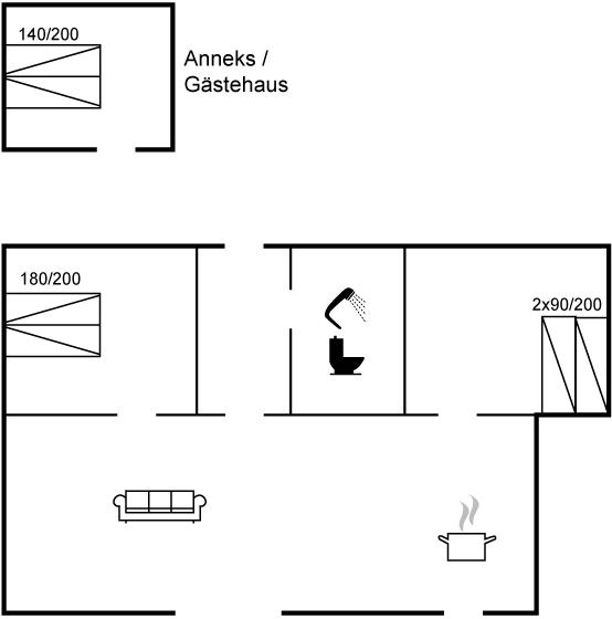 Der er i alt 3 soveværelser. Sovepladserne fordeler sig på: 4 sovepladser i dobbeltsenge. 3 sovepladser i enkeltsenge. 2 af disse sovepladser befinder sig i et anneks.