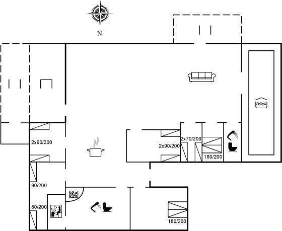 Der er i alt 6 soveværelser med hver 2 sovepladser. Der er 2 badeværelser med bruseniche og gulvvarme. I det ene er der desuden spa og sauna. Der vaskemaskine og tørretumbler.