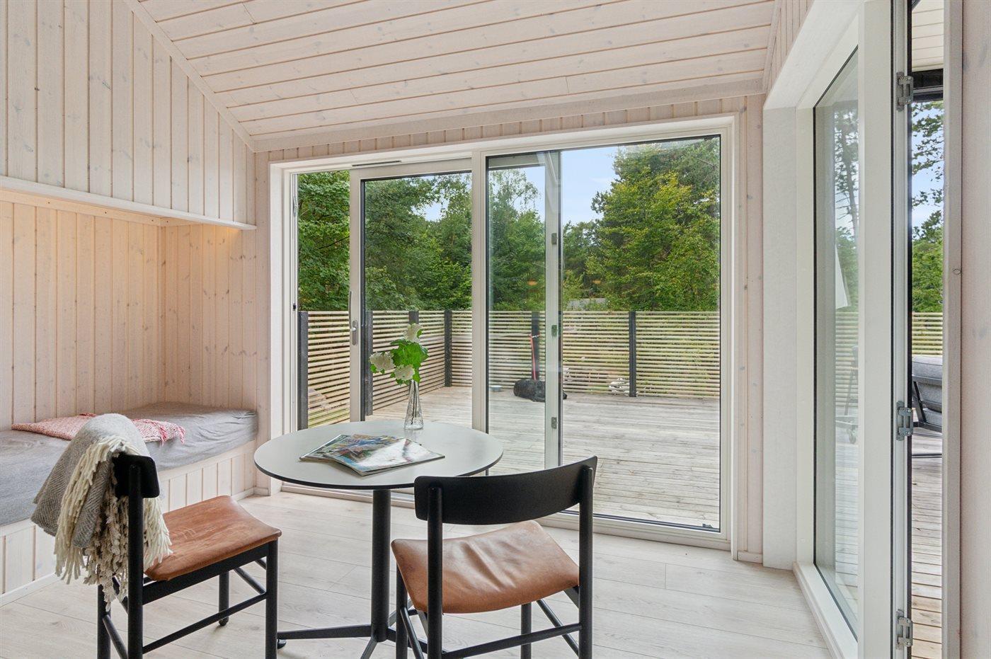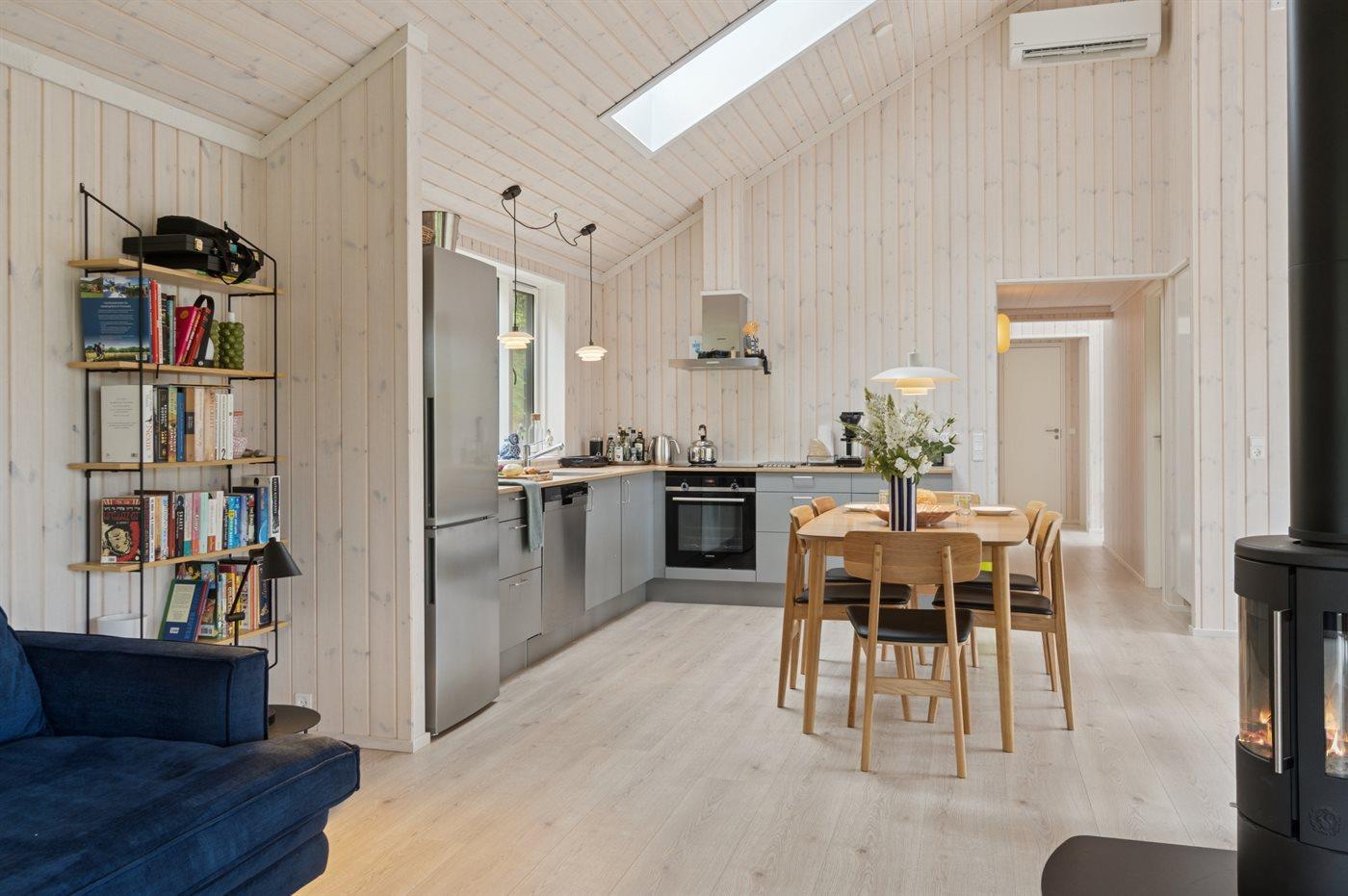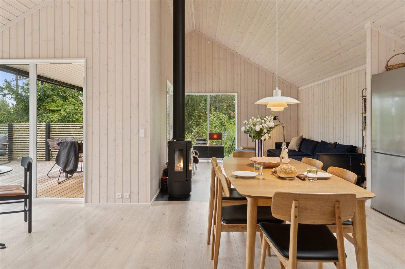 Huset er moderne og lyst og luftigt med masser af lysindfald fra de store vinduespartier og med loft-til-kip er huset rummeligt og rart at opholde sig i. Køkkenalrummet er i åben forbindelse med stuen og herfra er udgang til et stort dejligt terrasseområde, hvor en del af terrassen er overdækket med god mulighed for at finde skygge og læ og nyde de lange lyse sommeraftener.
