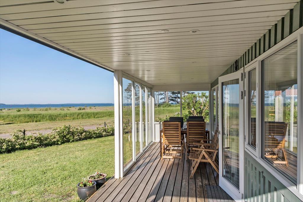 Opholdsstue med udsigt til vandet. TV med danske kanaler og ZDF, spiseplads og udgang til skøn overdækket og delvis lukket terrasse med havudsigt. Her kan måltidet nydes også på en lidt kølig aften.