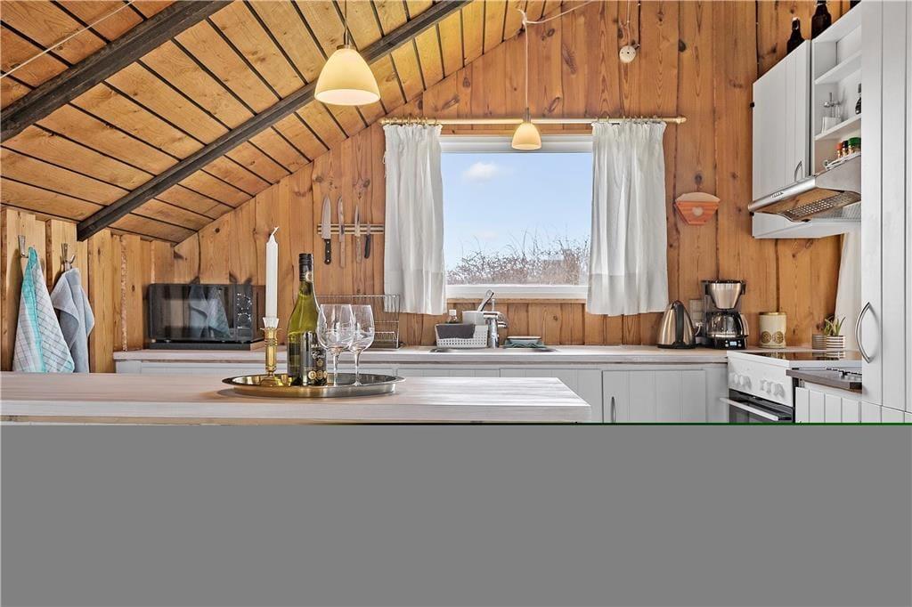 Spiseplads nær det åbne køkken som indeholder elkomfur med bageovn, mikroovn, køleskab samt alt det gængse i køkkengrej.