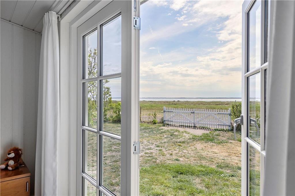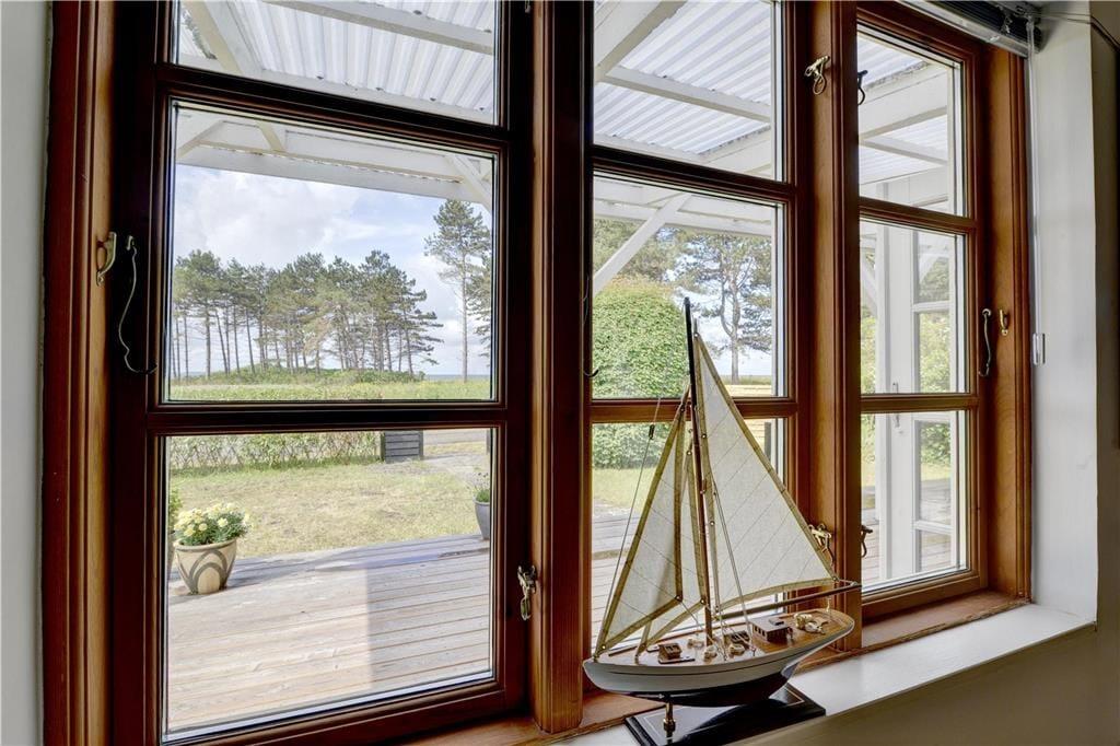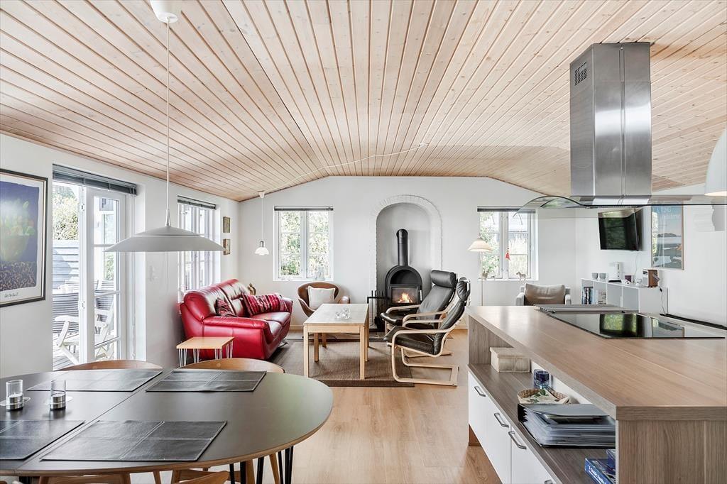 Opholdsstue med udsigt til vandet. Tv med danske kanaler, brændeovn, spiseplads og udgang til terrasse. Varmepumpe med køl.