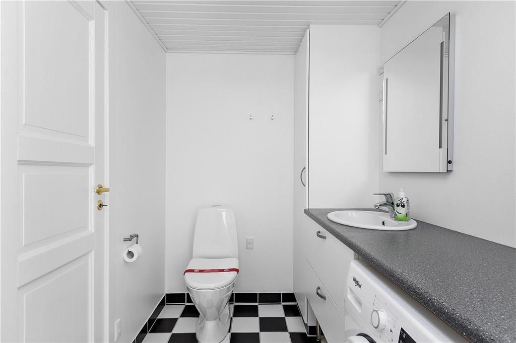 Badeværelse med toilet, håndvask, bruser og vaskemaskine og tørretumbler.