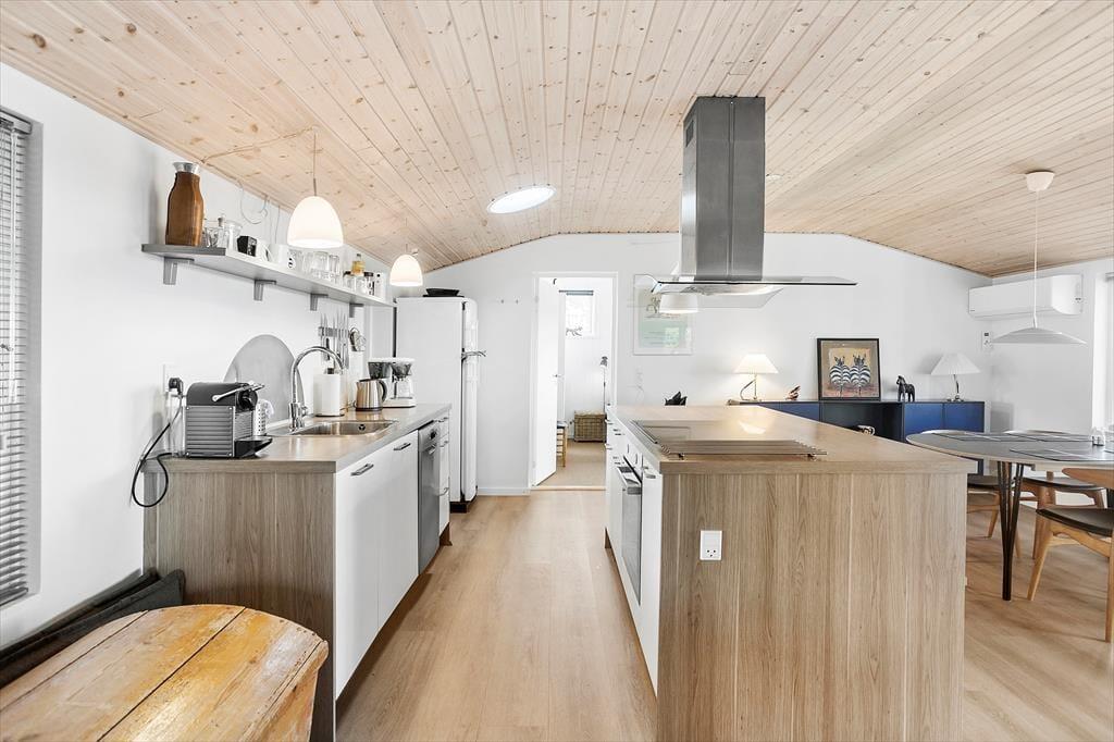 Åbent Køkkenhjørne med induktionskogeplader, bageovn, opvaskemaskine og køleskab med lille fryseskab.