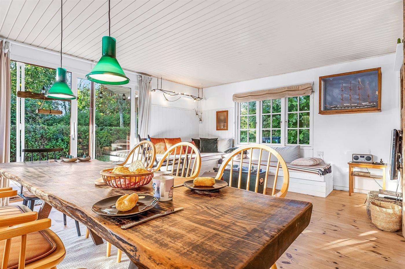 Hyggeligt sommerhus nær Grønsund med overdækket terrasse, anneks, bålplads og shelter på stor naturgrund.