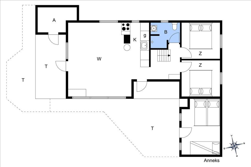 Sovepladserne fordeler sig på 2 fine soverum begge med dobbeltsenge og en hems med sovesofa. I annekset som ligger i forlængelse af huset, er der også en dobbeltseng og desuden en køjeseng med plads til 2 personer. Husets badeværelse er med toilet og brus.