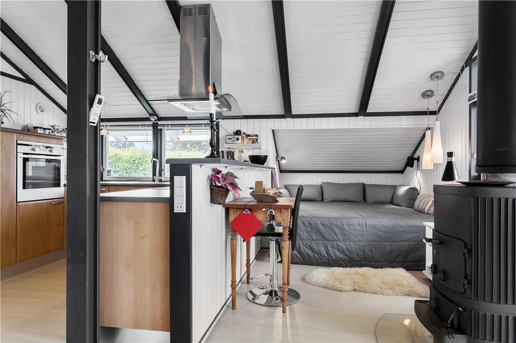 Træd ind i et lyst og indbydende sommerhus, hvor feriestemningen straks indfinder sig. Opholdsrummet er hjemmets hjerte – et dejligt samlingspunkt, hvor køkken og stue smelter sammen, så I kan nyde hinandens selskab, mens maden simrer, eller brætspillet er i fuld gang. Men det er udestuen, der virkelig sætter scenen for afslapning. Her kan du lade solen varme ansigtet bag de store vinduer, mens du nyder en stille morgenstund med en kop kaffe og havet som din baggrund.