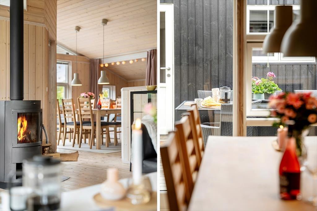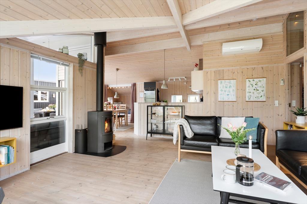 Sommerhusets hjerte er køkken/alrummet, som ligger i åben forbindelse med stuen som har god plads og som har et rigtigt flot lysindfald gennem de store vinduer som går fra gulv til loft.