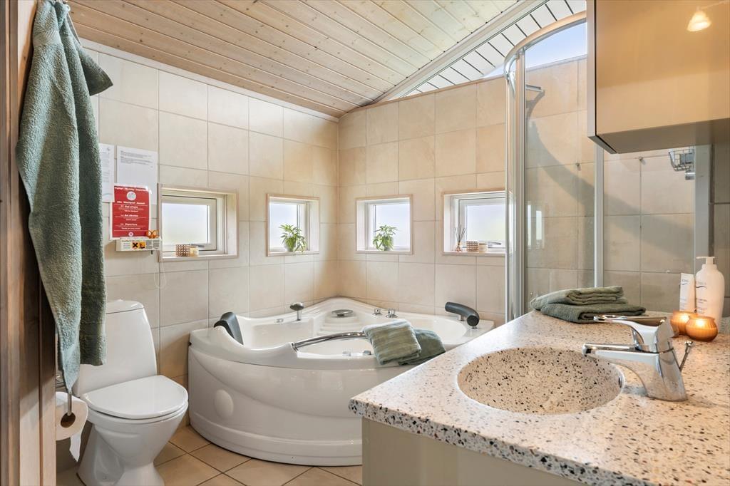 For den store familie er det et plus at sommerhuset har 2 toiletter. Et dejlig stort badeværelse med fin spa og sauna samt et gæstetoilet.