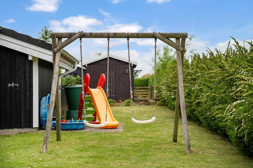 I haven er der legetårn med rutchebane, sandkasse til de mindste børn, 2 små fodboldmål og stigegolf.