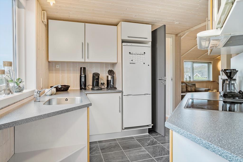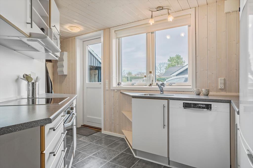 Køkkenet er det første rum, man træder ind i, og dette charmerende køkken er funktionelt indrettet med alle de faciliteter, du har brug for på ferien. Her er bl.a. opvaskemaskine, ovn og mikroovn samt kaffemaskine.